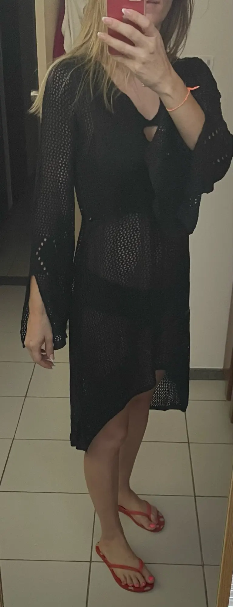 Он красивый и идеально подходит... Я получил на один размер больше, чем обычно. Это пляжное платье... Немного прозрачный.