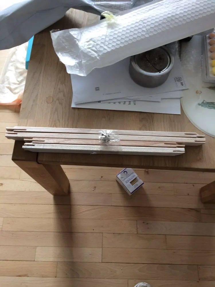 Доставка заняла : 26.08-13.10. Рамы пришли хорошо упакованы. Рамы сухие, но местами плохо обработаны, не только по краям, но и в середине рамы, например, торчит кусок древесины вверх. Нужно будет хорошо закрыть полотном. Ещё не собирали саму раму, надеемся, что не треснет, не поломается... Кнопки положены отдельно по мешочкам (~14-16 штук). Получается, что рама дорого обходится при таком качестве. -