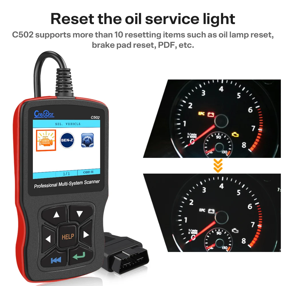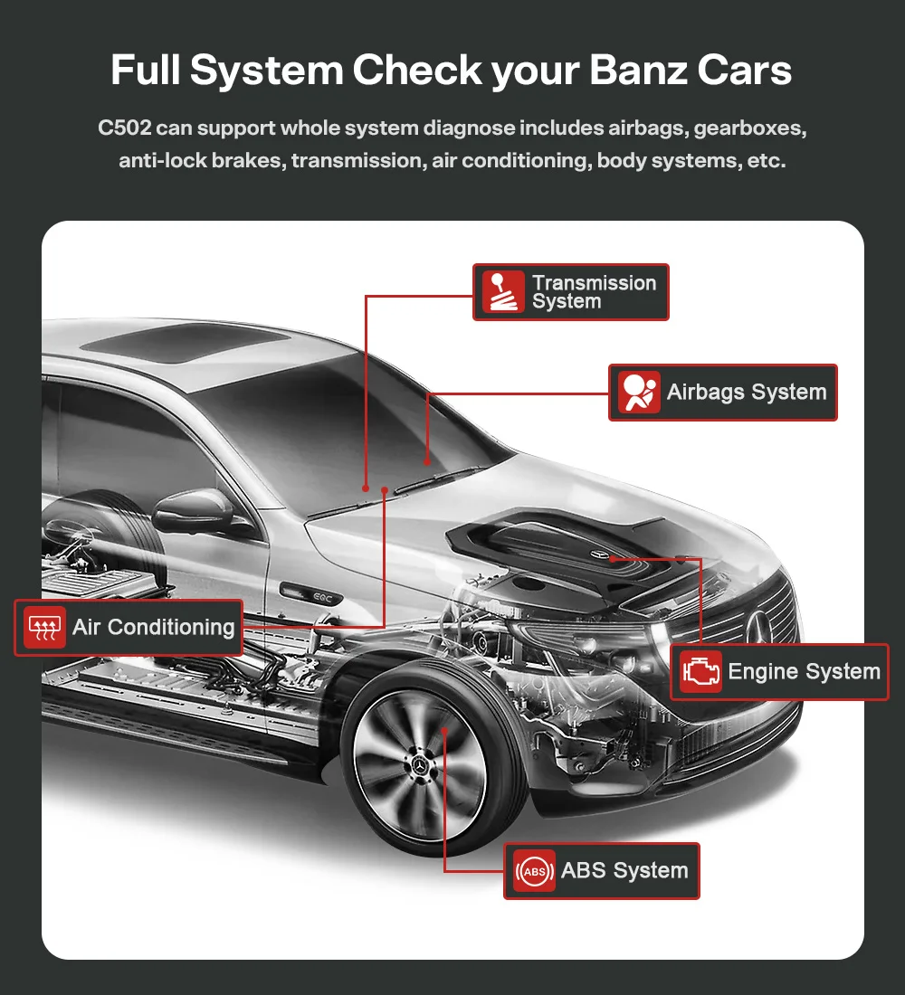 C502-это многофункциональный диагностический инструмент, разработанный для моделей Mercedes, который позволит вам читать и очищать все диагностические неисправности классов в Mercedes. Такие как ETC-электронное управление передачей, ME-SFI-моторная электроника, AB-подушка безопасности, ABS-антиблокировочная тормозная система, EZS-электронный переключатель зажигания. У нас также есть функции OBDII, которые позволяют сканировать все показания двигателя и соответствующие коды неисправностей на любом более позднем изготовителе/модели транспортного средства. Для самостоятельных пользователей и сотрудников небольших служб. Этот продукт поставляет цветной ЖК-дисплей и presonalized меню funtion. C502 будет лучшим решением для домашних пользователей и профессиональных техников, Сэкономьте ваше время и деньги на станцию обслуживания!