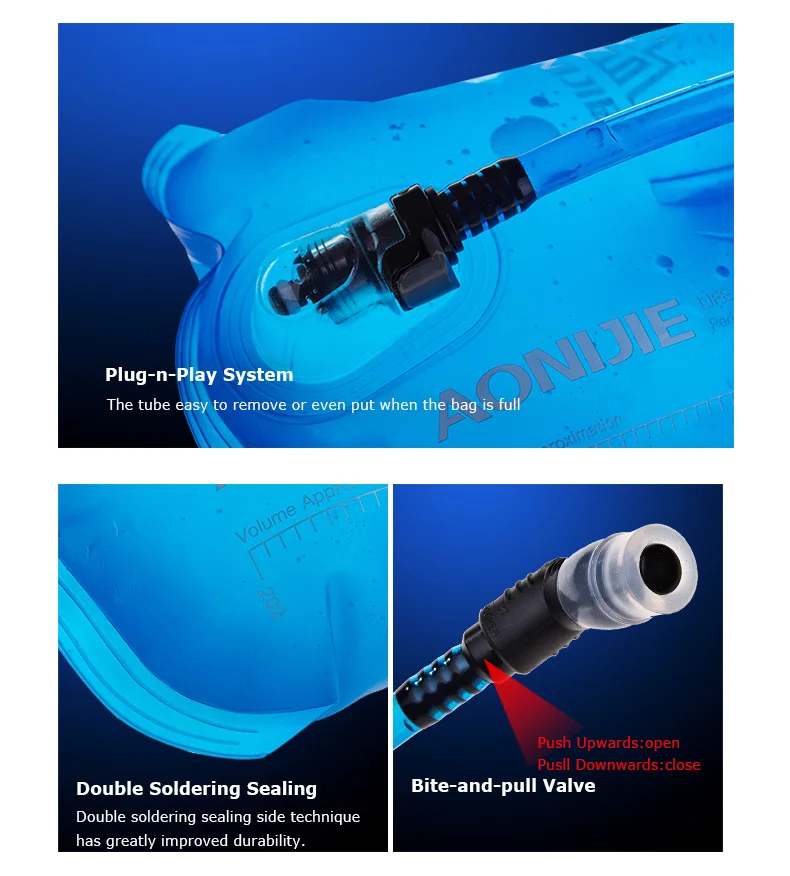 -1.5L/ 2L/ 3L мешок для воды, конечное средство против обезвоживания -Легкая и быстрая гидратация благодаря системе plug-n-play, открытая с ртом, специально разработанная система вкл/выкл для надежного закрытия клапана во время движения -Гибкая трубка длиной 105 см, совместима со всеми рюкзаками Aonijie, розетка сбоку, защитная деталь для насадки -PVS и бисфенол-бесплатно, ТПУ (термопластичный полиуретан) материал