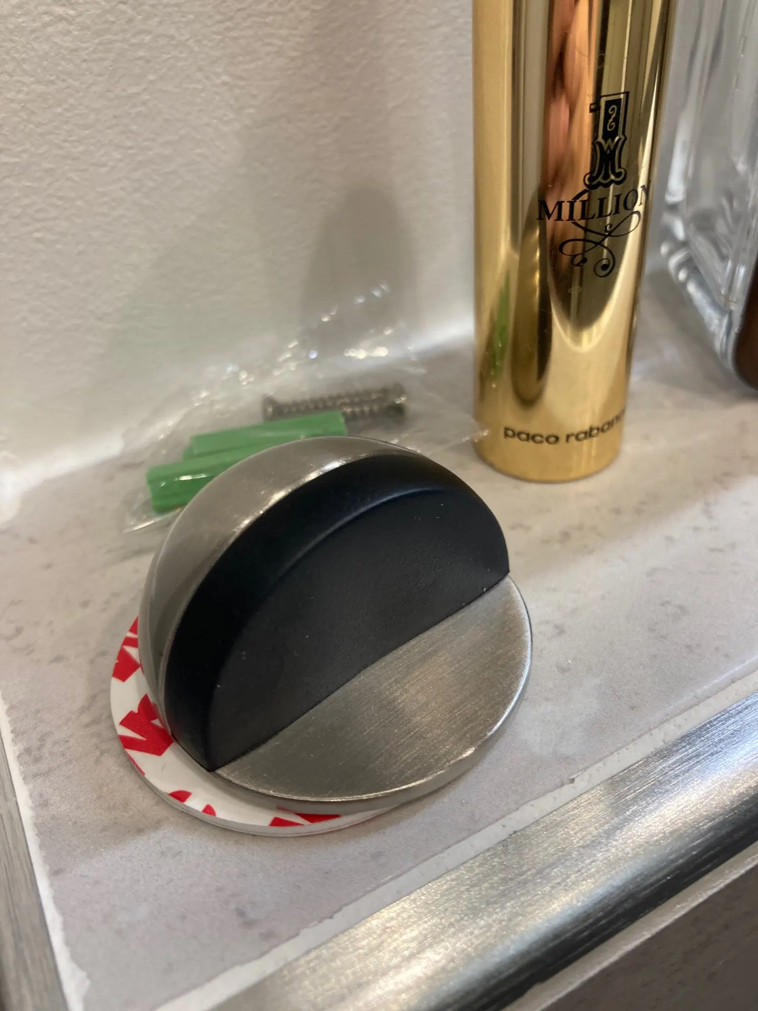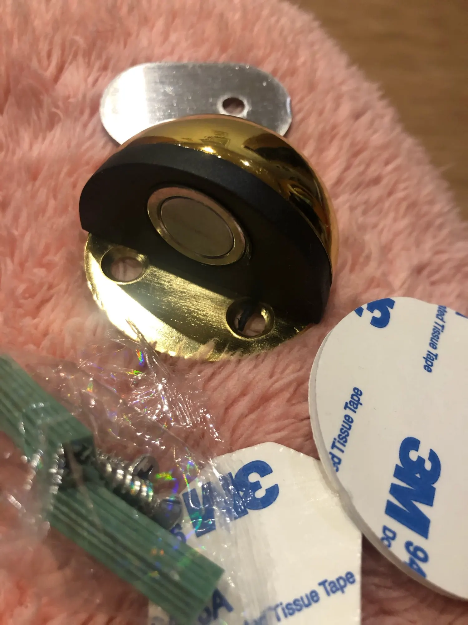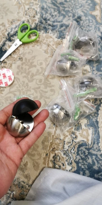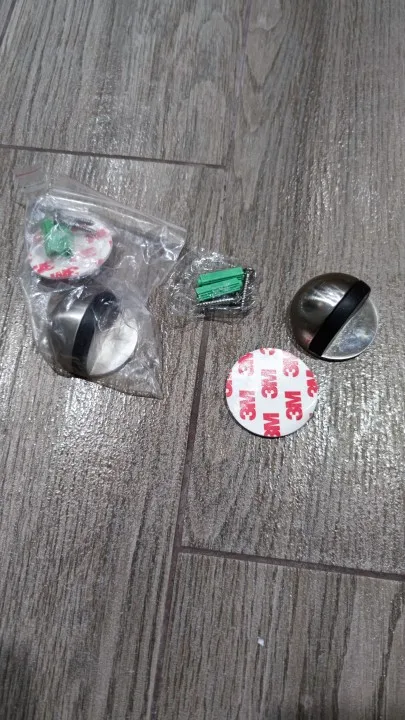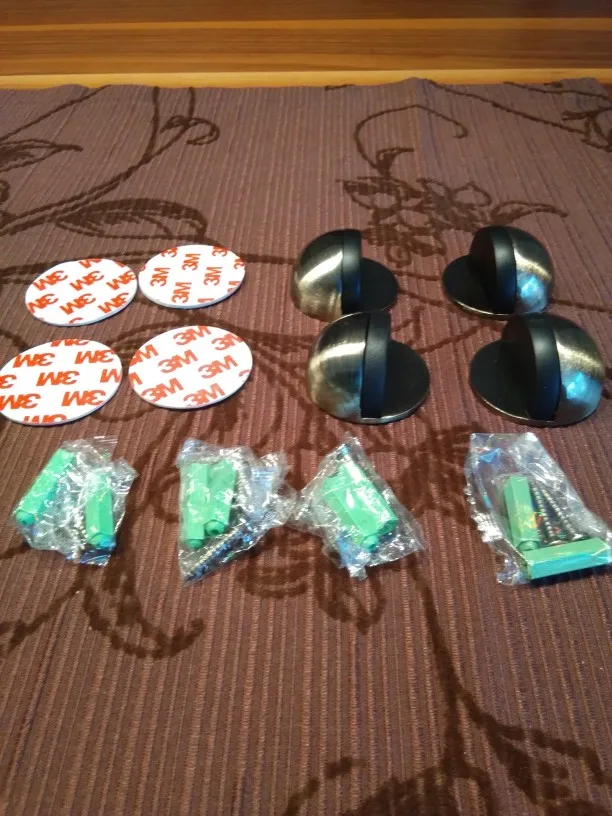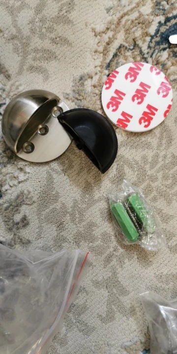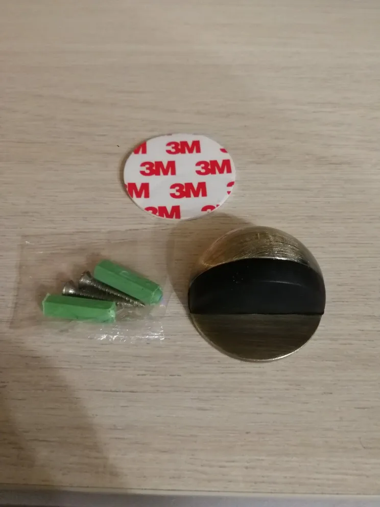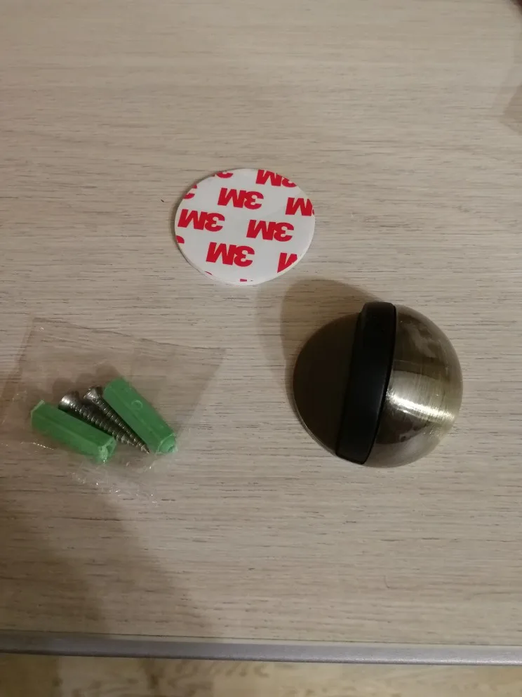 Всё ок! Металл крепкий. В комплекте двухсторонний скотч 3М. Липнет норм. Дверь держит. В комплекте ещё есть дюбель гвозди. Немного зацарапана поверхность. Не критично. Продавцу спасибо!