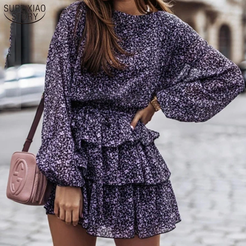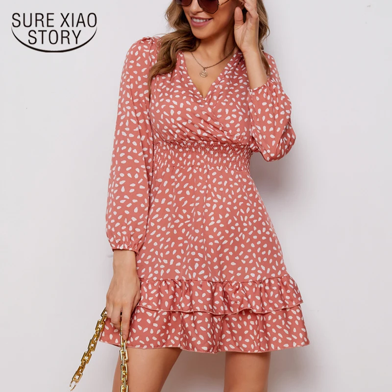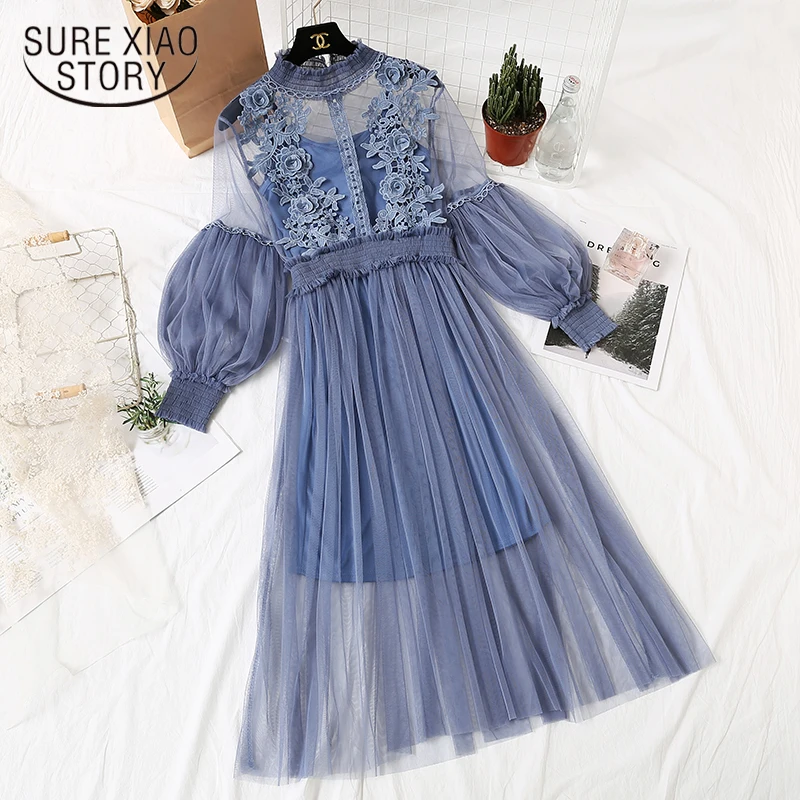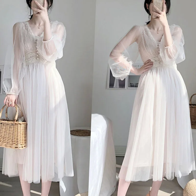 Платье для женщин 2021 Весна размера плюс элегантное платье в форме трапеции, срукавами-буфами, с завышенной талией и v-образным вырезом, женские Сетчатое платье 8126 50