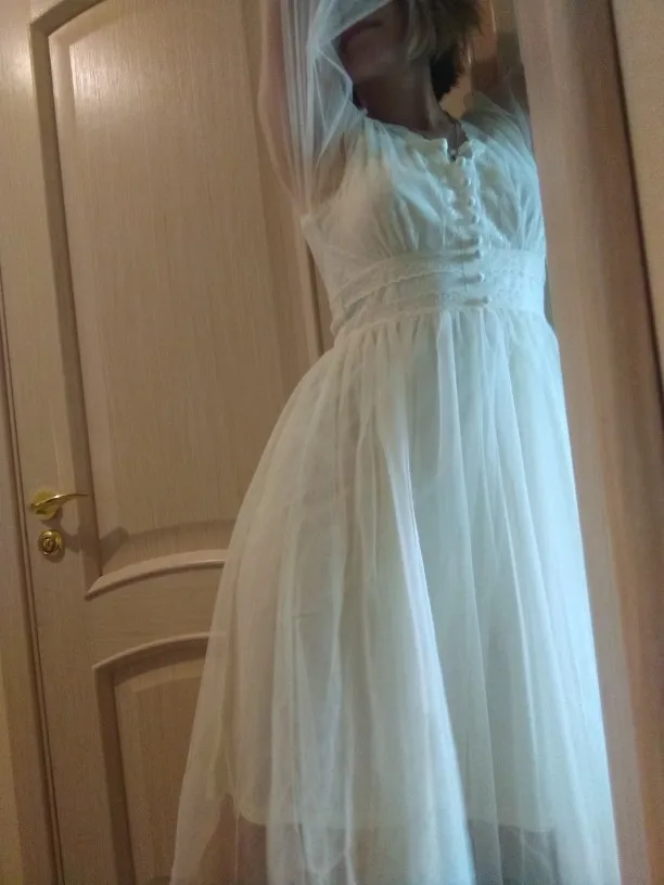 Платье выглядит как на фото, правда оно нежно лимонное, а не белое. Но есть одно большое НО — оно практически прозрачное, хоть и двухслойное. На фото видно, как просвечивает даже светлое бельё, нужно ещё какой то подклад. Это огорчило, хотя в целом платье могло быть отличным (