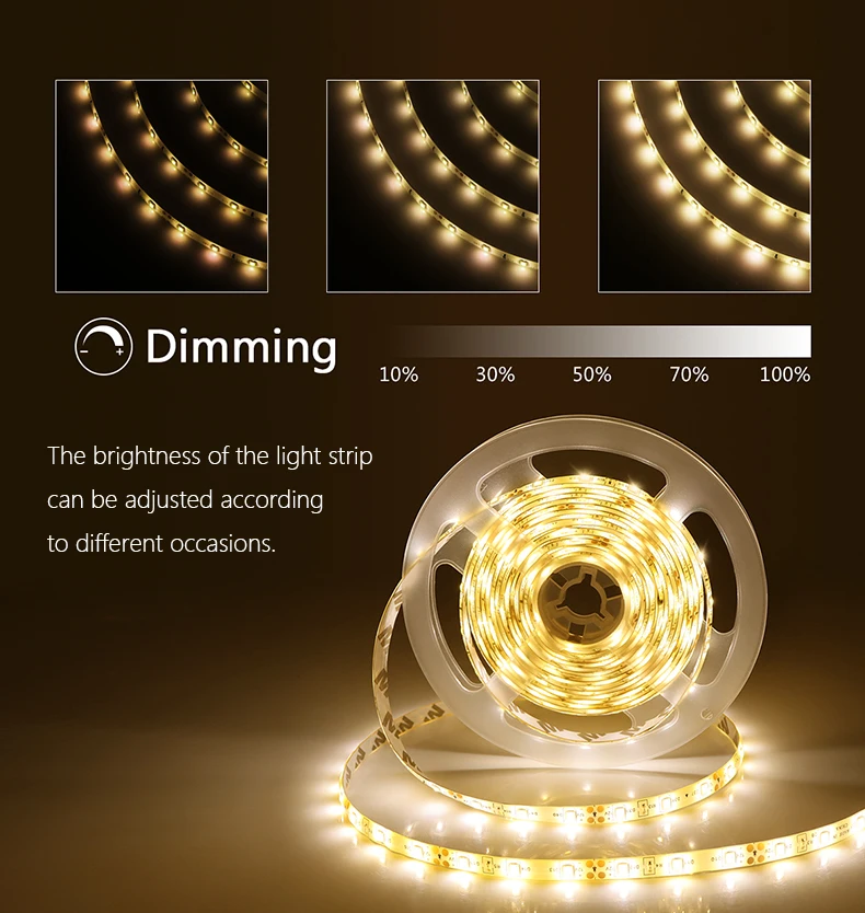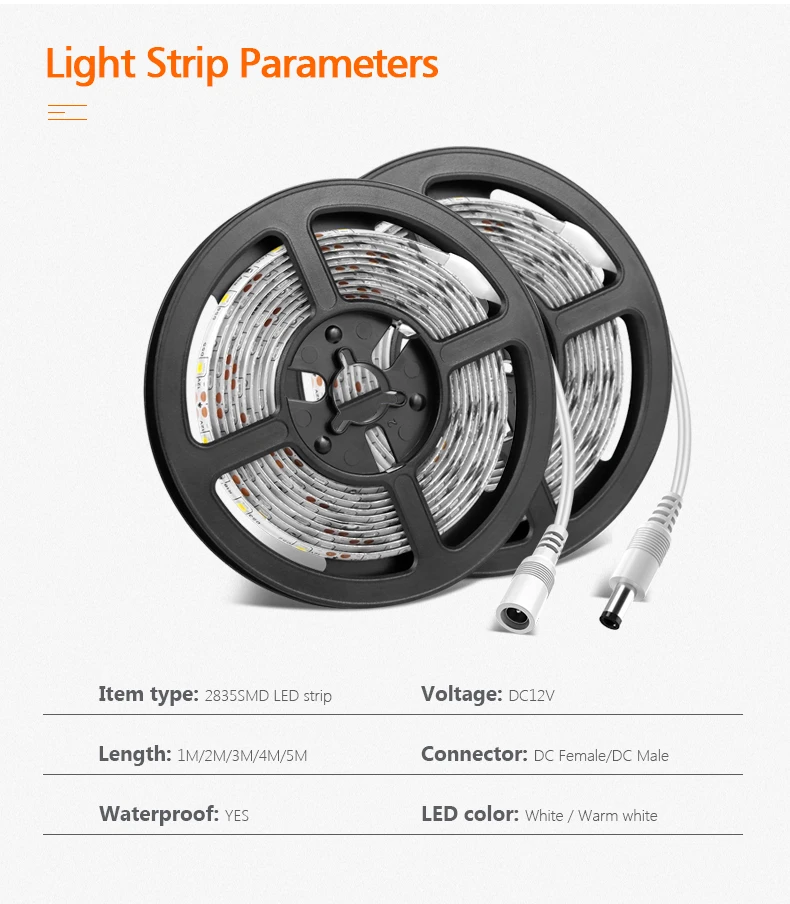 Характеристики:Тип: Светодиодная лента 12 В 2835Тип светодиодов: 2835SMDКоличество светодиодов: 60 светодиодов/мКласс водонепроницаемости: IP65Длина: 1 м/2 м/3 м/4 м/5 мСветильник Цвет: белый/теплый белыйЦветовая температура: белый (6000k-6500K); Теплый белый (2700K-3500K)Яркость: плавная регулировка, Длительное нажатие на переключатель для изменения яркостиИсточник питания: адаптер питания 2AИдея для шкафа, шкафа, лестницы, кухни, домашнего декора.