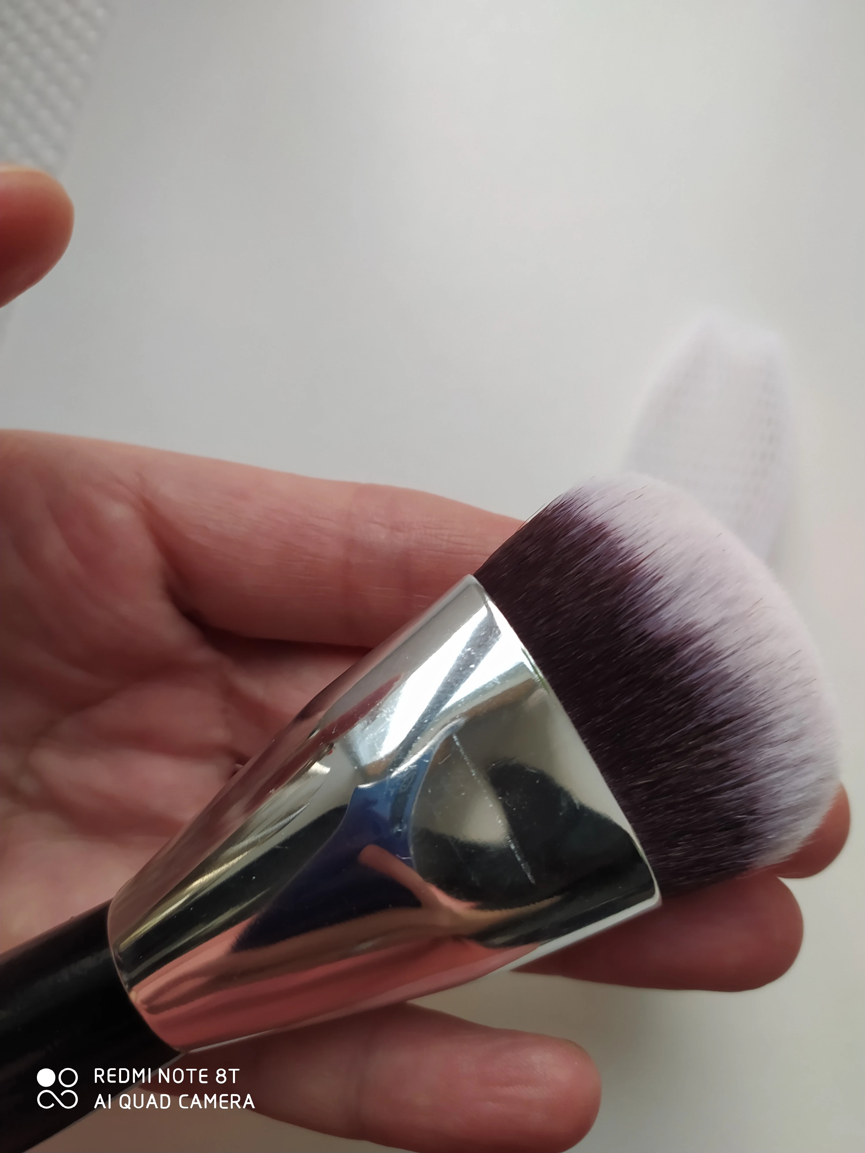 плотно набитая синтетическая кисть для тона или жидких текстур. работать удобно и приятно, не лезет, не полосит. размер вполне удобный для быстрого нанесения тона