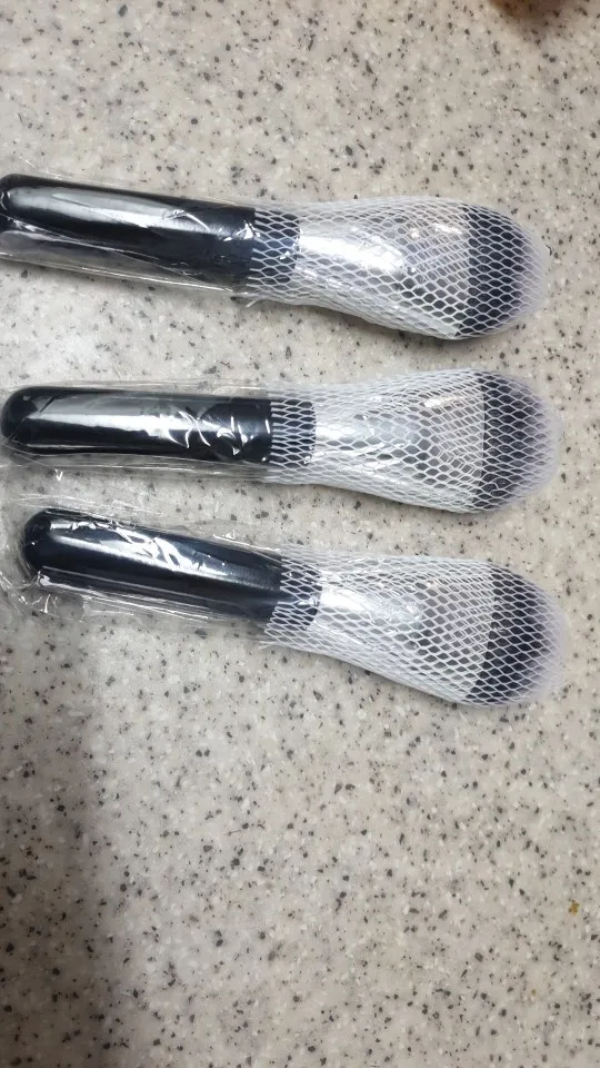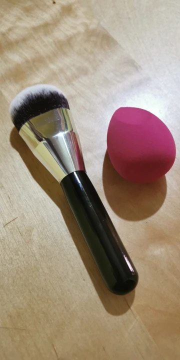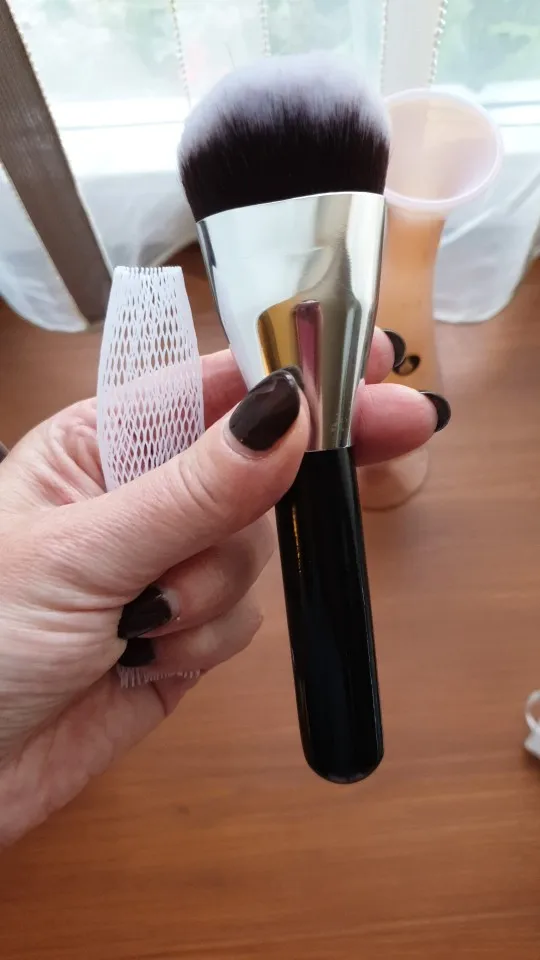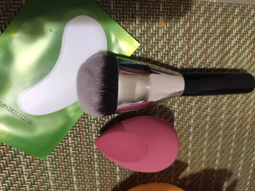 Хорошо упаковывается в пластиковый держатель. Товар, как показано на картинке. Щетинки не линяют, они довольно мягкие. Из кисти выпадает несколько ворсинок, но их можно подрезать или аккуратно вытягивать. Губка для макияжа, как и ожидалось, и приятное дополнение. Куплю снова.