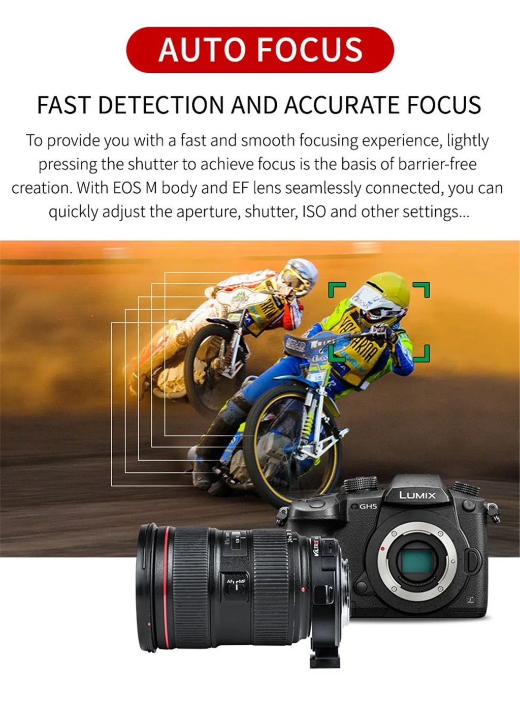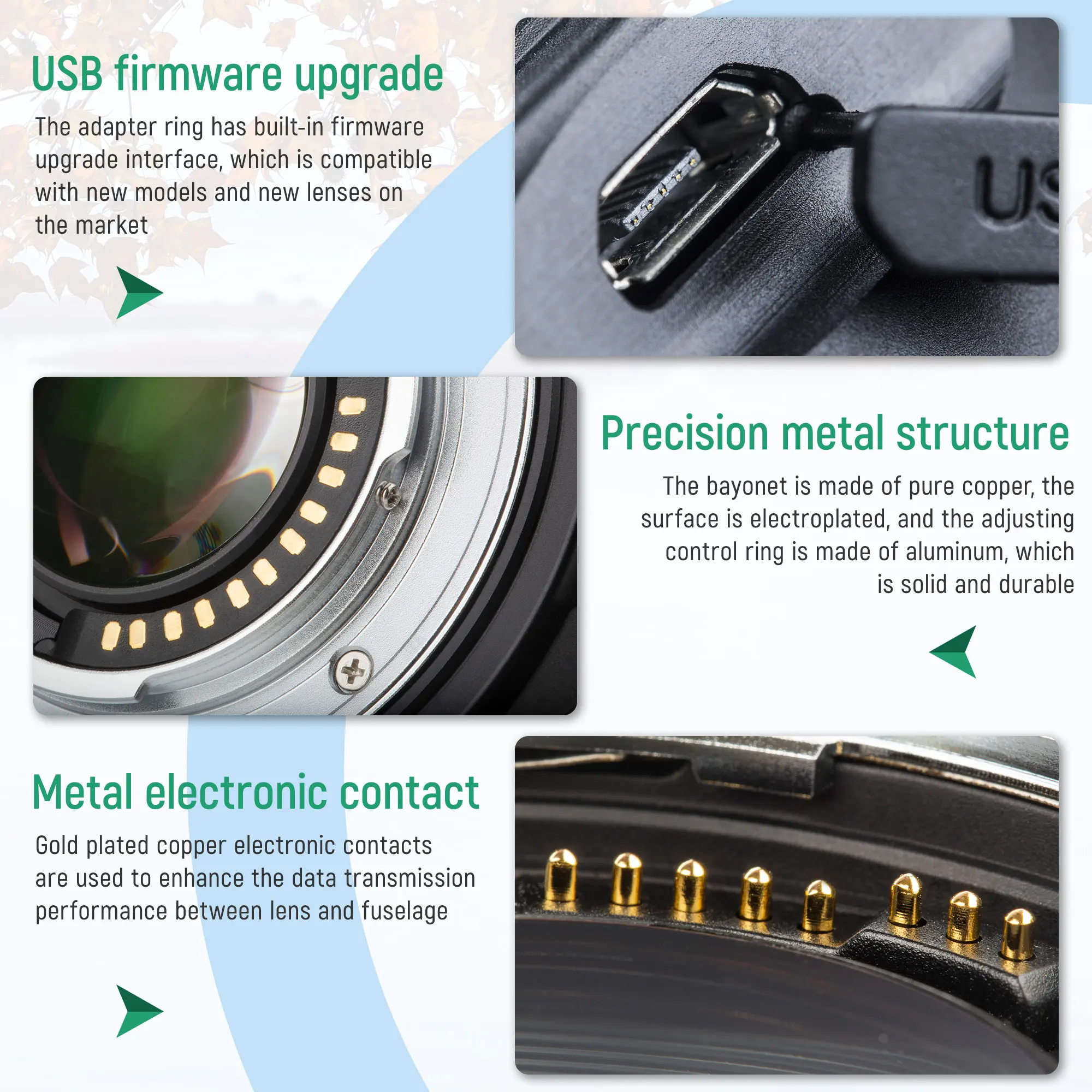 Встроенный usb-порт для обновления прошивки адаптера-4 элемента в 4 группах оптика увеличивает светильник на входе одним F стоп и уменьшает фокусное расстояние на x0.71-Выделенный переключатель для выбора между детектором контрастности и режимом автоматического фокуса-Функция автофокусировки контрастности позволяет перемещать гибкое пятно и фокусироваться по рамке и поддерживать фокусировку глаз на конкретной камере #-Автоматическое определение фаз фокусировки позволяет быстрее фокусироваться на большинстве линз.-Высокоточный алюминиевый сплав с хромированным покрытием на обеих монтажных поверхностях для обеспечения гладкой установки и долговечности.