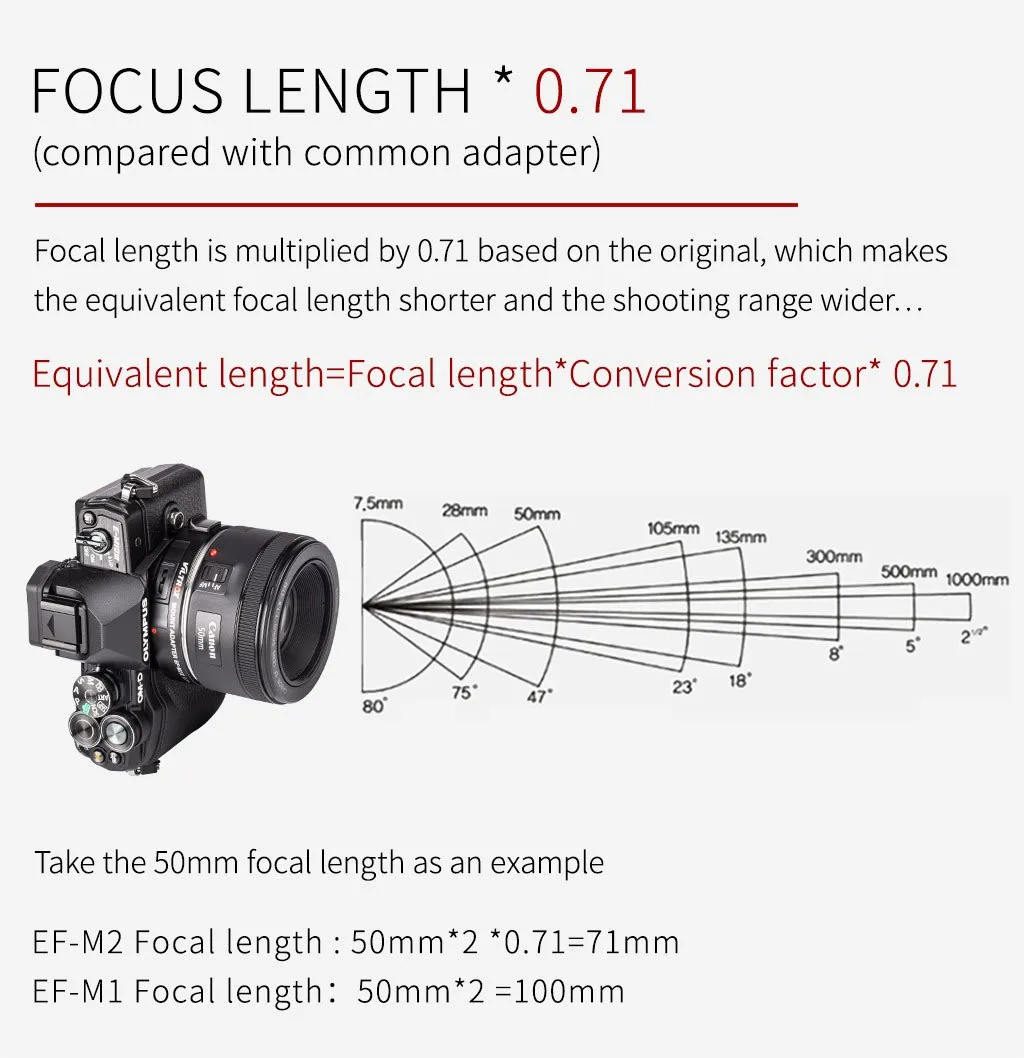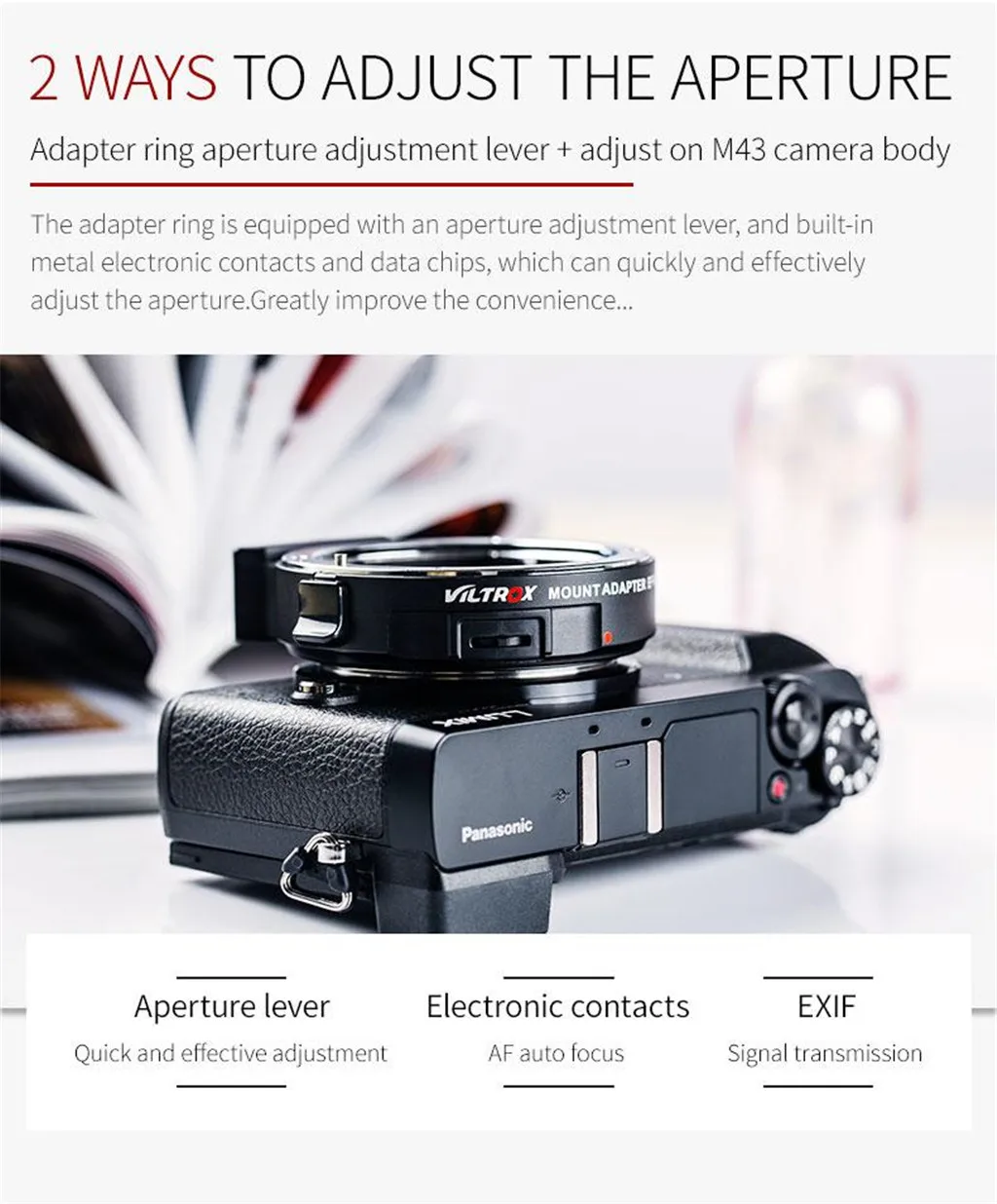 Адаптер крепления Viltrox EF-M2II предназначен для Canon EF-mount series lens для использования на камере M43.Плюс 0,71 на основе оригинального Фокусное расстояние (эквивалент фокусное расстояние = фокусное расстояние x0.71), который поможет увеличить диафрагму 1 уровня. Встроенный 4 группы, 4 шт оптических очков, AF (автофокус) и регулируемой диафрагмы и т. Д.Чтобы обновить прошивку адаптера, последнюю прошивку можно загрузить с официального сайта, подключить адаптер к компьютеру с помощью usb-кабеля и скопировать файл в память адаптера. Не требуется прикрепить объектив или камеру.Чтобы изменить режим AF, выключите камеру, выньте батарею, Вставьте батарею и включите камеру снова, чтобы камера распознает новый режим AF как новый объектив. Медленный фокус будет происходить на низких концах линз в режиме CDAF