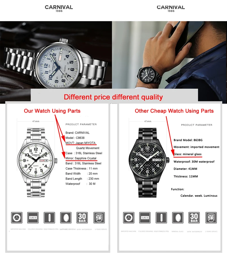 К сожалению, часы могут отличаться из-за погрешности в производстве на ремне! Отверстия для пружинного стержня слишком маленькие и глубокие! Также являются светящимися маркерами из-за внутреннего кольца в темноте, которые почти не читаются. В качестве повторного заказа стоимость товаров будет намного выше!