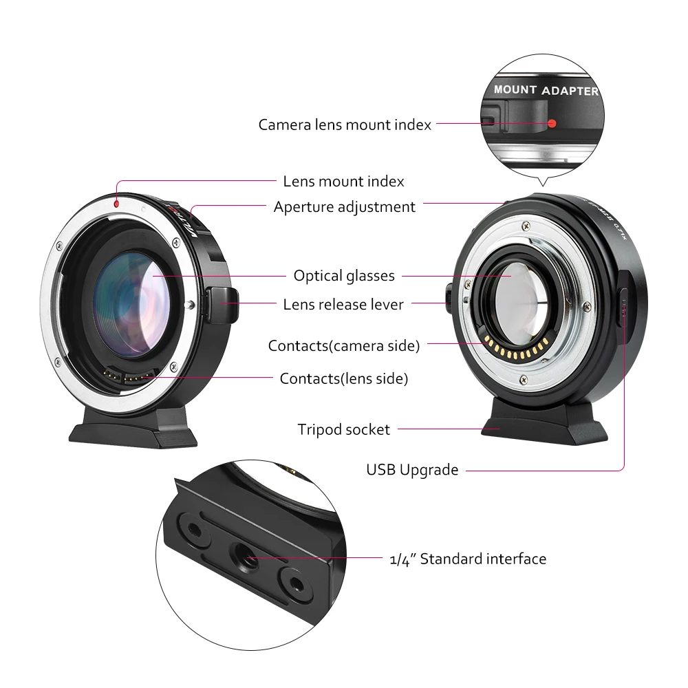 Viltrox EF-M2II крепление адаптер предназначен для того, чтобы позволить для объектива USM Canon EF mount объектив для использования на M4/3 камеры. Плюс 0,71 на основе оригинального Фокусное расстояние (эквивалент фокусное расстояние = фокусное расстояние x0.71), который поможет увеличить диафрагму 1 уровня. Встроенный 4 группы, 4 шт. оптические очки, AF (автофокус), регулируемая апертура и т. Д. Особенности: Позолоченный электронный контакт, автофокус, функция. Он может воплотить в жизнь AF, регулируемую диафрагму от корпуса камеры до диафрагмы объектива. Более прочный металлический материал. Позволяет использовать объективы серии Canon EF для камеры M4/3. Длина Фокуса: 0,71x. Совместимая камера Micro Four Thirds: Olympus E-M10/E-M10 |/E-M10/E-M5 |/E-M5/E-M1 |/E-M1/E-PL8/E-PL7/E-PL5/E-PL3/E-PL2/E-PL1/PEN-FE-PM2/E-PM1/E-P5/E-P3/E-P1/E-M5; Panasonic GH5/GH4/GH3/GH2/GH1/GF9/GF8/GF7/GF6/GF5/GF4/GF3/GF2/GF1/GX85/GX8/GX7/GX1/G7/G6/G5/G3/G1/G1. Совместимые линзы: Canon EF 11-24 мм F7.0L USM Canon EF 16-35 мм f/2.8L II Canon EF 17-40 мм f/4 Объектива USM Canon EF 20-35 мм f/2,8 L Объектива USM Canon EF 20-35 мм f/3,5-4,5 USM Canon EF 24-70 мм f/4L IS USM Canon EF 24-70 мм f/2.8L II USM Canon EF 24-105 мм f/4L IS Объектива USM Canon EF 24-85 мм f/3,5-4,5 USM Объектива USM Canon EF 24-105mm f/3,5-4,5 Для Canon EF 28-80 мм f/3,5-5,6 II Для Canon EF 28-135mm f/3,5-5,6/E7 Canon EF 70-200 мм f/2.8L IS II USM Canon EF 70-200 мм f/4L Объектива USM Canon EF 70-300 мм f/4-5,6 Объектива USM Canon EF 14 мм f/2,8 L Canon EF 24 мм f/2,8 Canon EF 24 мм f/1.4L Canon EF 28 мм f/1,8 Canon EF 35 мм f/1.4L Canon EF 35 мм f/2.0L Canon EF 40 мм f/2,8 STM Canon EF 50 мм f/1,8 II Объектива USM Canon EF 50 мм f/1,4 USM Canon EF 50 мм f/2,5 Canon EF 85 мм f/1,8 USM Canon EF 85 мм f/1,2 л II USM Canon EF 100 мм f/2,0 Макрообъектив Canon EF 100 мм f/2,8 Canon EF 135 мм f/2.0L Объектива USM Canon EF 180 мм f/3,5 L Canon EF 200 мм f/2.8L Canon EF 300 мм f/4L IS Canon EF 400 мм f/4,0 DO IS USM Canon EF 400 мм f/5,6 л Canon EF 500 мм f/4L IS USM Tamron AF 17-50 мм f/2,8 Di-II LD 18-270 F3.5-6.3 SP24-70mm f/2,8 Di-cvc USD 150-600 мм f/5-6,3 SP35MM F1.8 DI cvc USD SIGMA 24-35 мм f/2 DG 24-70 мм f/2,8 DG 70-300 мм f/4-5,6 DG 120-300 мм f/2,8 DG 24 мм f/1,4 DG 35 мм f/1,4 DG 85 мм f/1,4 DG Светодиодная лампа для видеосъемки YONGNUO EF 50 мм f/1,8 Технические характеристики: Торговая марка: Viltrox Модель: EF-M2II Совместимые линзы: для объективов серии Canon EF Совместимая камера: для камер серии M4/3 s Режим фокусировки: автоматический фокус Длина Фокуса: 0,71x Оптические очки: 4 группы, 4 очки Разъем штатива: Cu 1/4 "* 1 Диаметр и длина: 6767 мм × 25 мм Передняя крышка: крышка камеры Задняя крышка: Пылезащитная крышка объектива Вес изделия: прибл. 138g/4,9 oz (исключая крышки) Посылка Размеры: 11*10*6 см/4,3*3,9 * 2.4in Вес посылка: 310 г/10,9 унций Посылка список: 1 * Адаптер для крепления на EF-M2II 1 * Передняя крышка 1 задняя крышка 1 * Руководство пользователя (английский и китайский) Примечание: Это нормально, что он немного свободный, когда адаптер для крепления объектива установлен на камере Panasonic и немного туго на камере Olympus. Камера и объектив в комплект не входят.