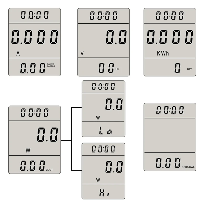 Общее количество кВт/ч и отображение стоимости: 0.000квт/ч-9999квт/ч 0,00 евро-9999 евро