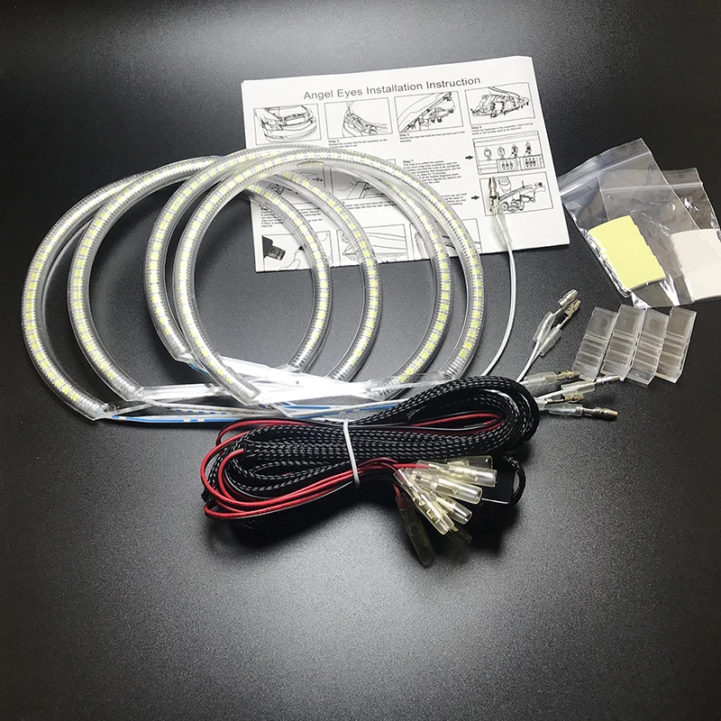 1, высокое качество SMD 3528 супер СВЕТОДИОДНЫЙ индикатор яркости 2, используется для фар автомобиля-маркер-ангельские глазки 3, всего 4 кольца или 2 кольца для ближнего и дальнего света; 4, агрессивный, но чистый и стильный светодиодный светильник. Идеально подходит для вашего биммера, если вы приобрели стандартную базовую посылка, но хотите обновить свой автомобиль до более роскошного вида.Характеристика: