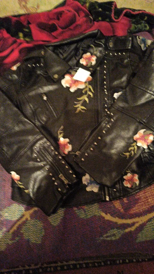 Куртка женская из искусственной кожи, с цветочным принтом и вышивкой