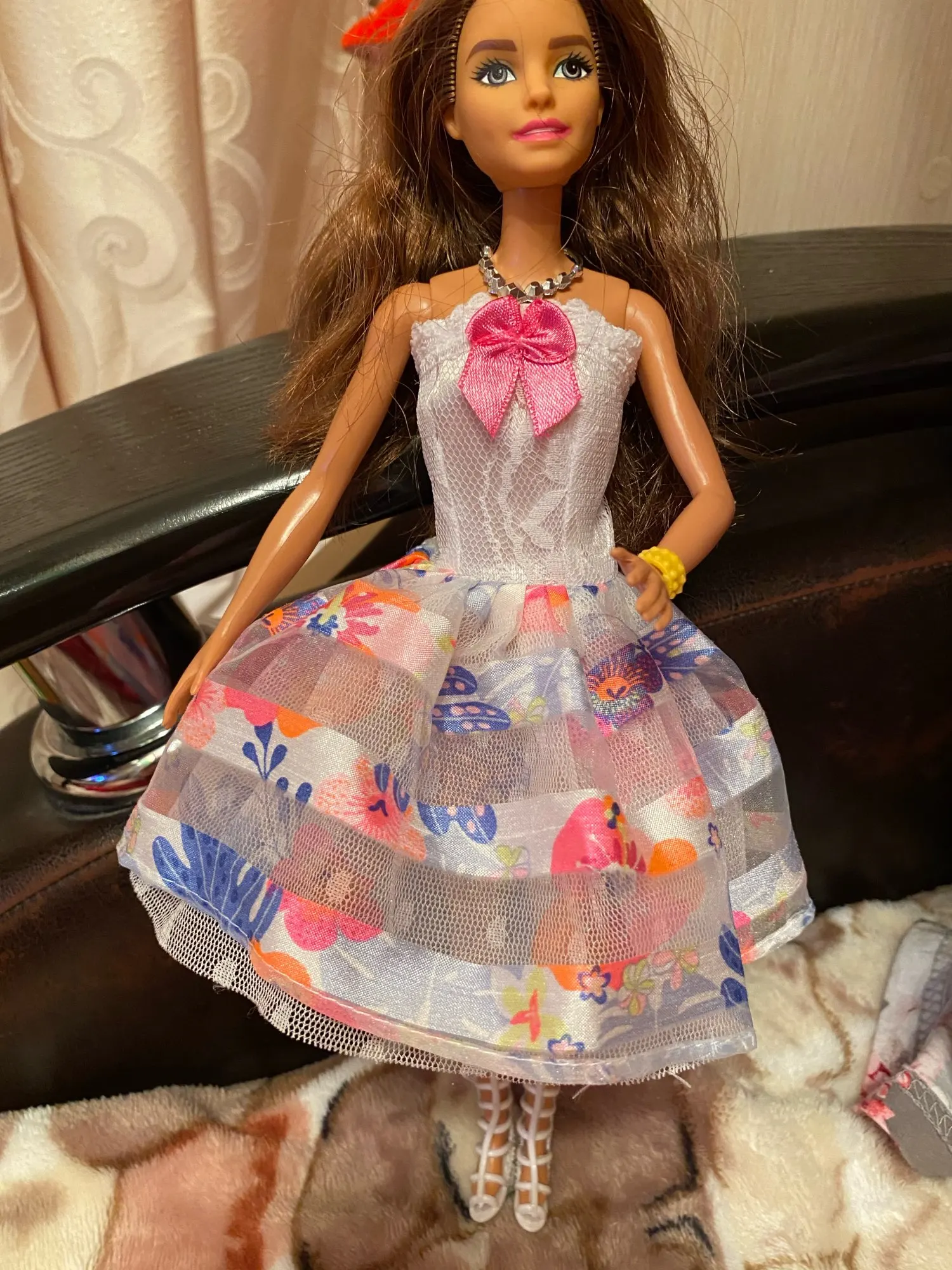 Доставка месяц. Красивое платье. Подошло Барби йоге. Швы ровные, нитки не торчат. Рекомендую.