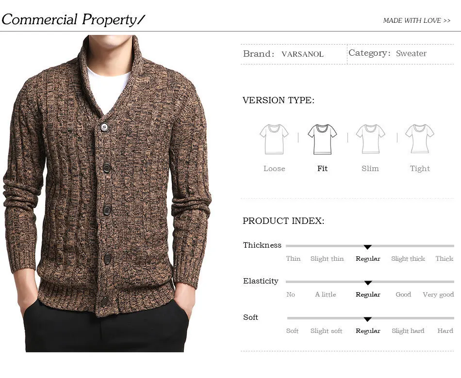 Мужской свитер Varsanol, вязаный Повседневный свитер из 100% хлопка с длинным рукавом и треугольным вырезом на кнопках, 2 вида цветов