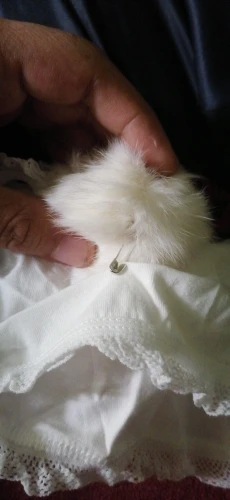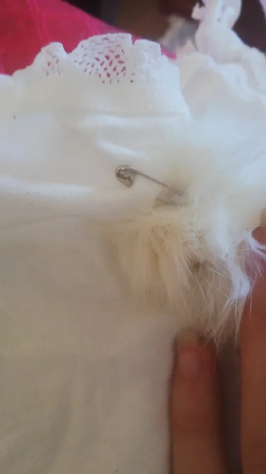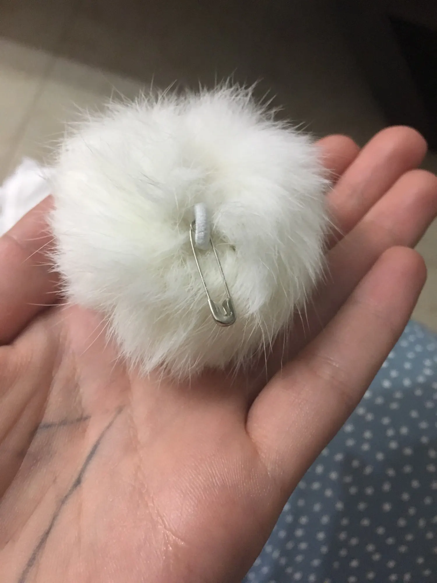 Черная ткань выглядит грязно, а хвост кролика соединен с булавкой, а не с пуговицей. Не то, что я ожидал. Поэтому мне нужно пришивать на нем кнопку, прежде чем я смогу дать ее моей девушке...