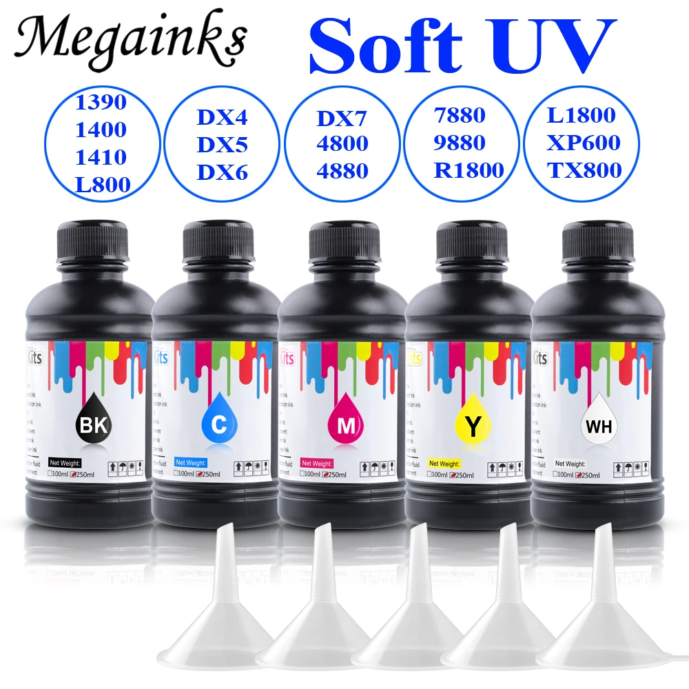Светодиодные УФ-чернила 250 мл для принтера Epson 1390, 1400, DX4, DX5, DX6, DX7, мягкие УФ-чернила для планшетного струйного принтера Roland Mimaki, 5 шт.