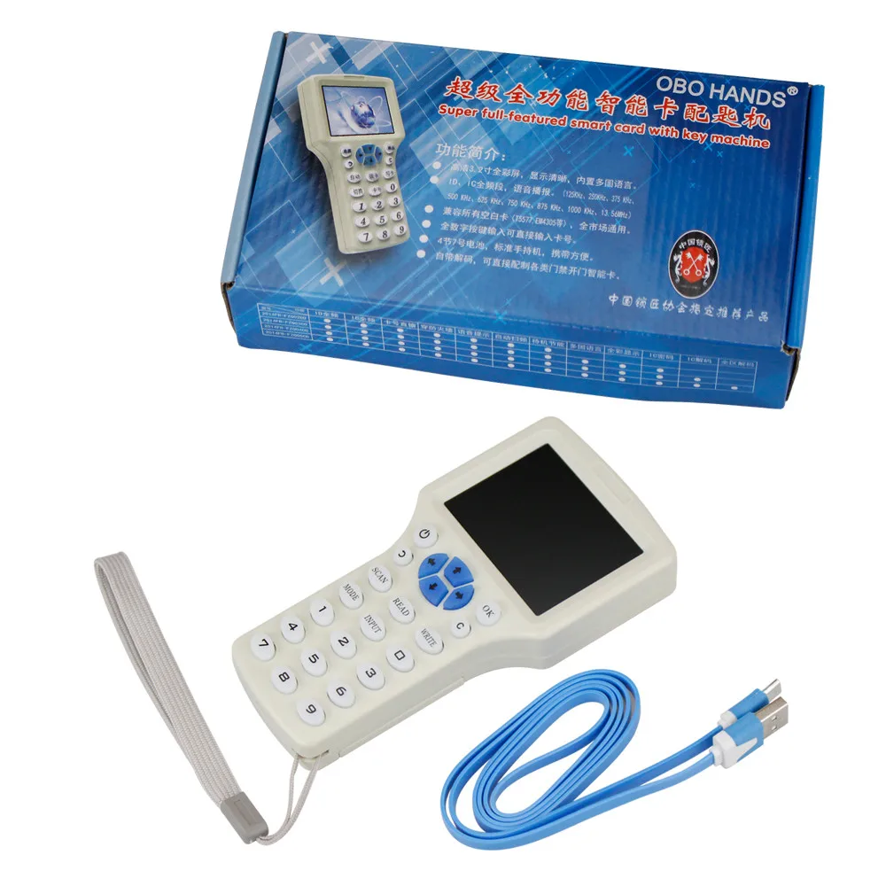 Полноцветный экран HD 3,2 дюйма, четкий дисплей, встроенный многоязычный. ID,IC full-band, голосовая передача.(125 кГц, 250 кГц, 375 кГц, 500 кГц, 625 кГц, 750 кГц, 875 кГц, 1000 кГц, 13,56 МГц) Цифровые клавиши для ввода номера карты можно вводить напрямую. 4 на 7-й батарее (посылка не включает батарею), стандартная трубка, легко носить с собой. Поставляется декодирование, прямая подготовка различных смарт-карт двери доступа.