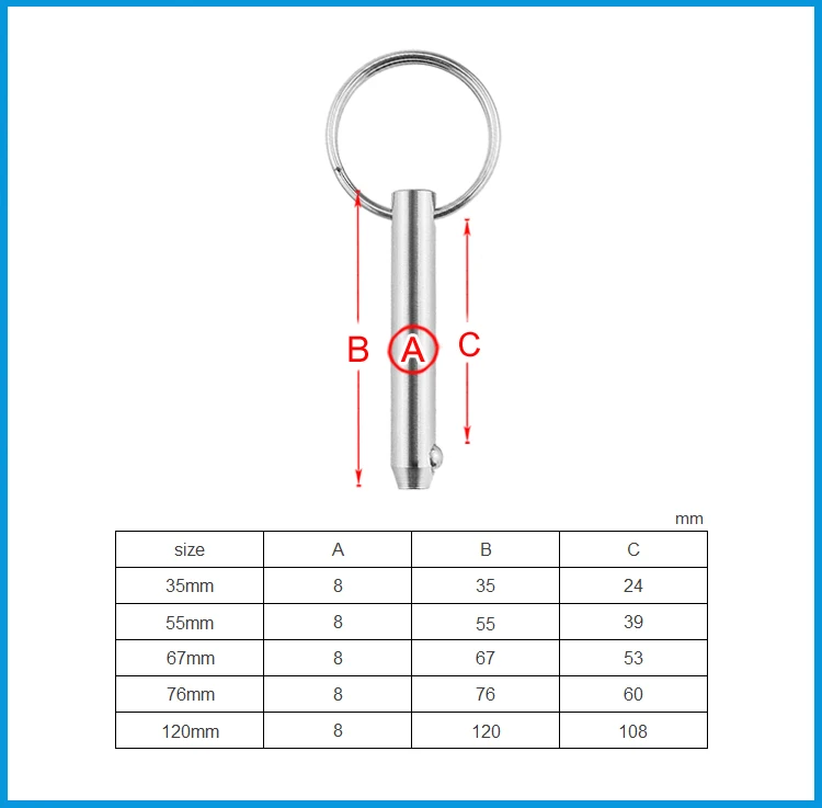 Пружинный шарик в наконечнике штифта удерживает его на месте, крепкий против вертикальной тяги в качестве петли, но вылезает чисто с боковым тягом. Стальное кольцо позволяет легко тянуть.