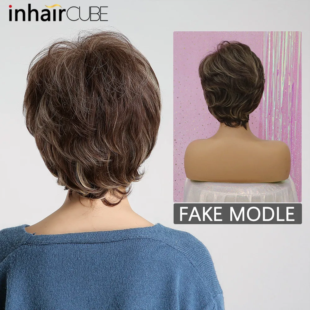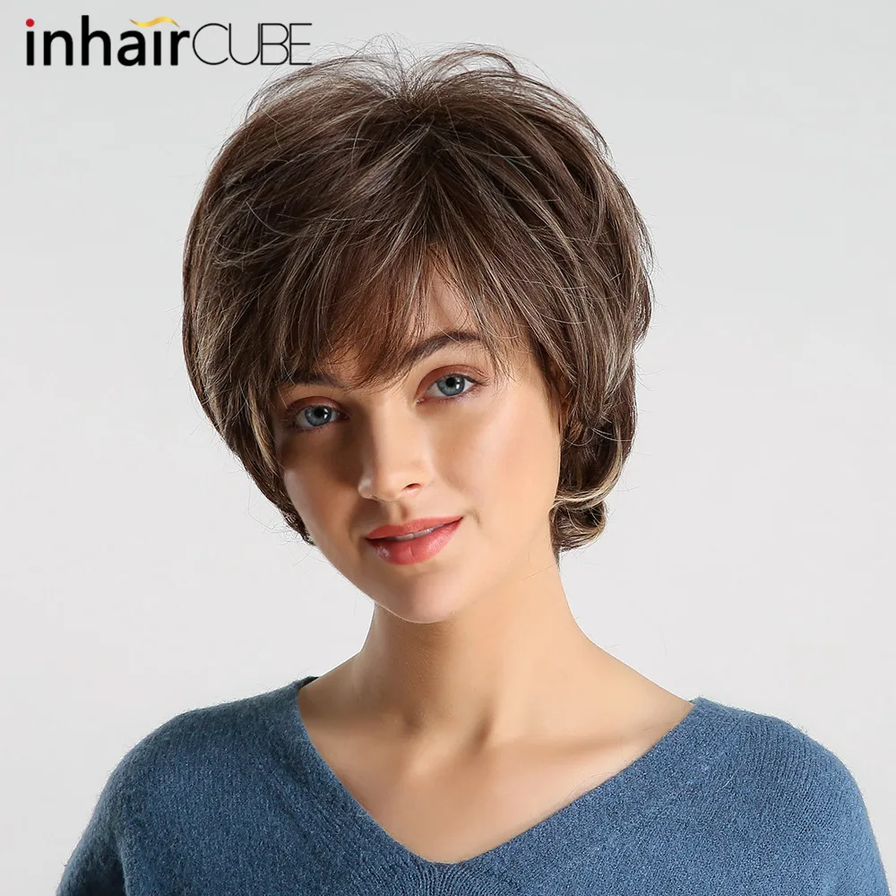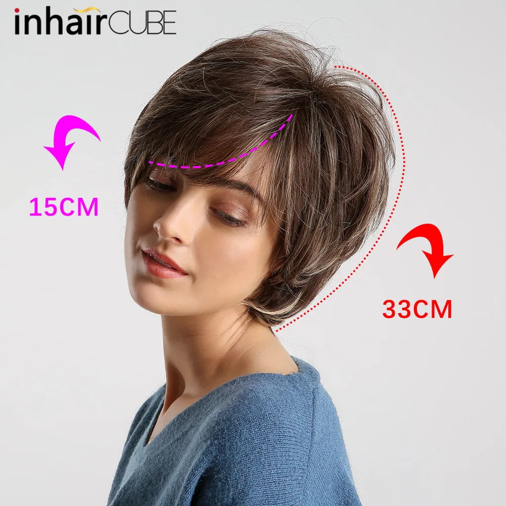 ESIN Женские парики с естественной челкой из искусственных волос Многослойное окрашивание в пепельно-коричневый цвет Короткая стрижка в стиле Пикси с прямыми волосами