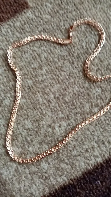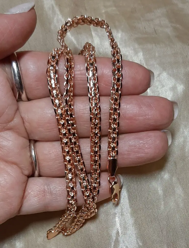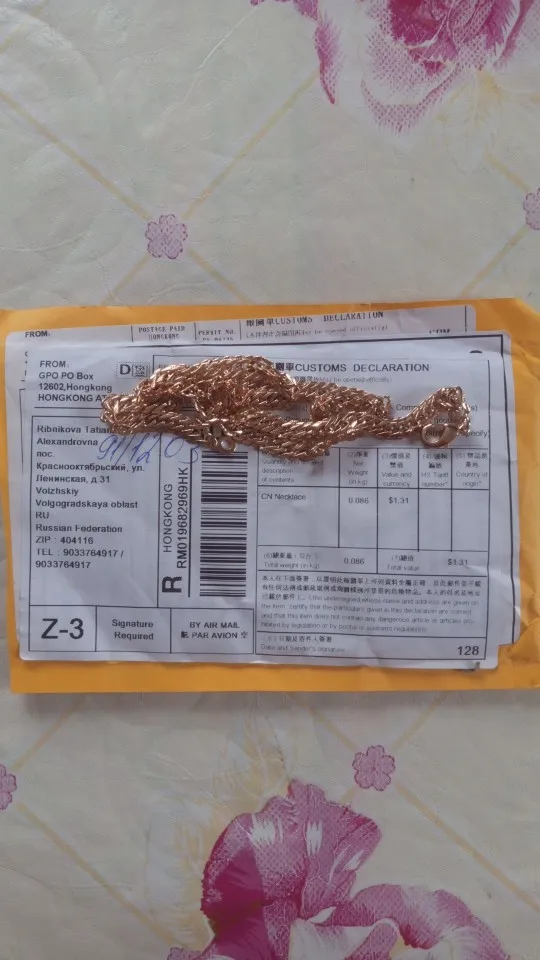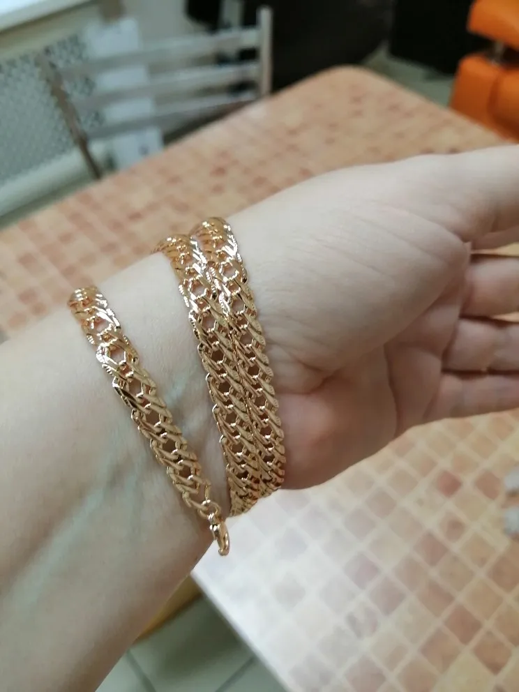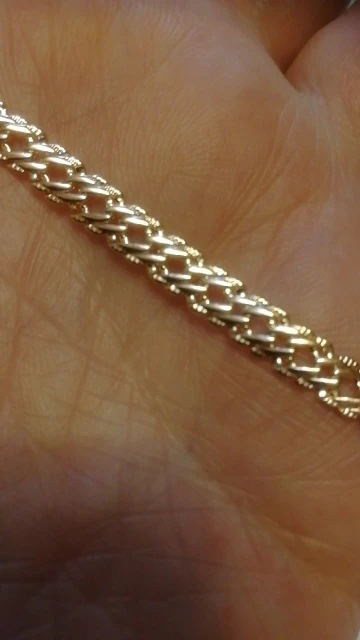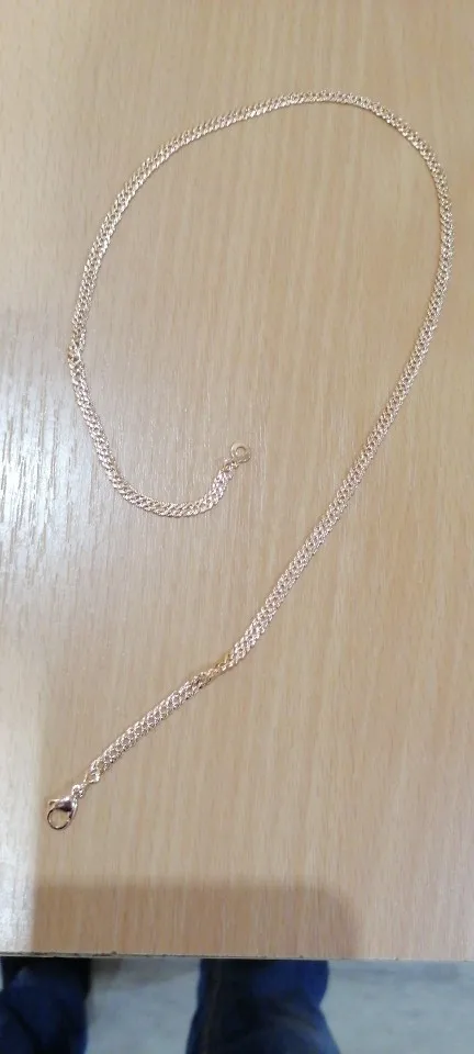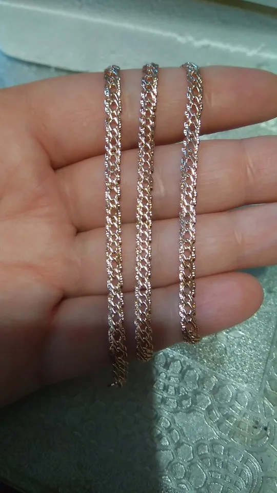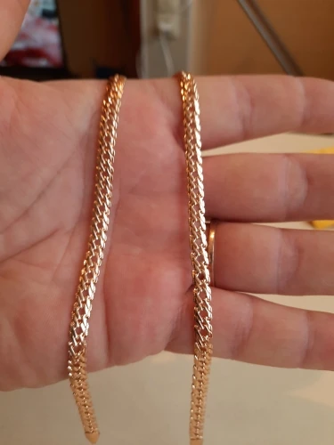 Получила цепочку, пришла целая. Продавец положил в подарок браслетик, очень мило. Доставка быстрая, меньше месяца в Свердловскую обл.. Цепочка красивая, тяжелая, покупала к кулону из розового золота. От золота конечно отличается немного розовит и сильно блестит. Если носить отдельно то мало кто отличит от золота. Спасибо большое продавцу, рекомендую.
