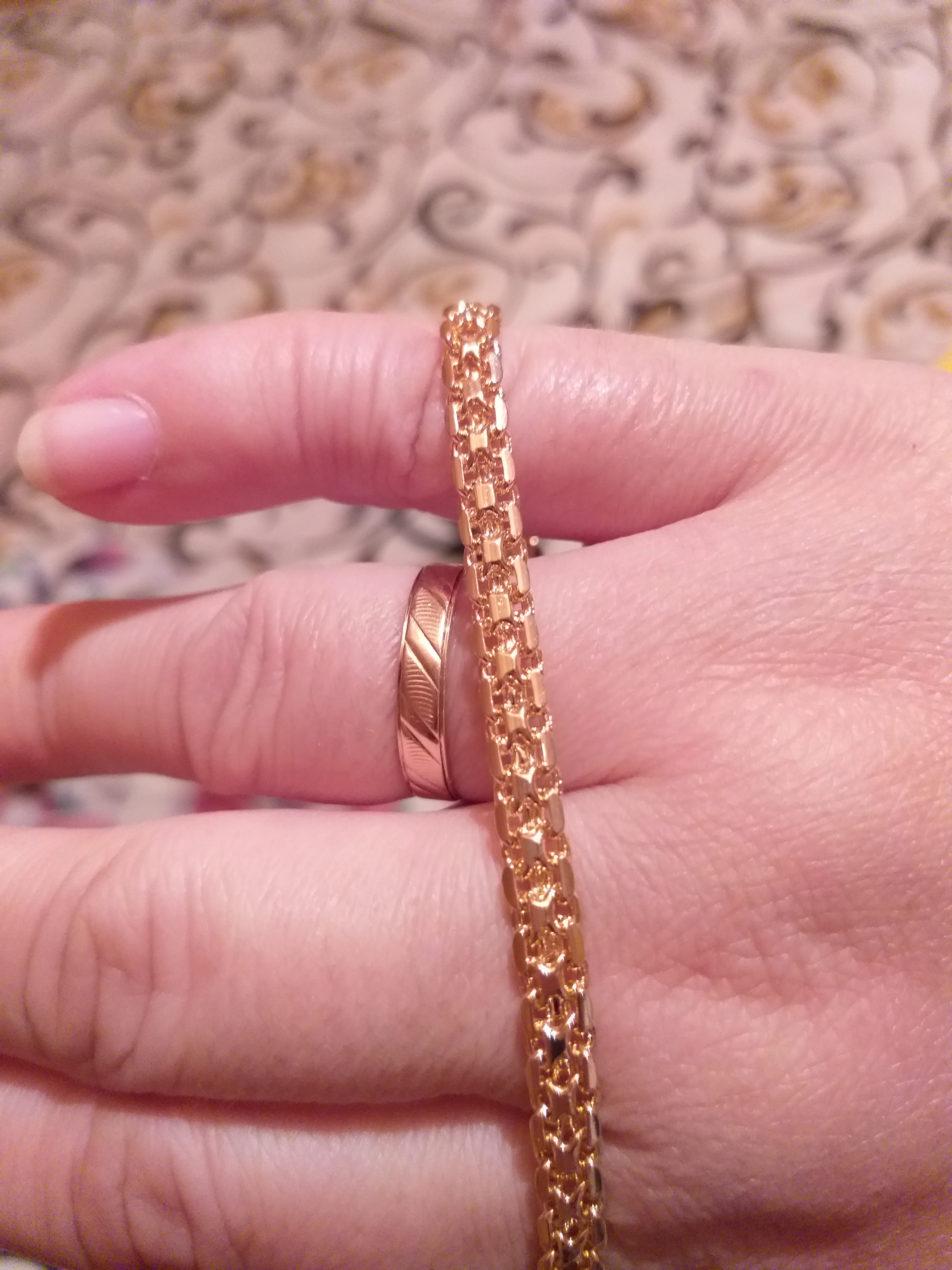 в Целом не плохая цепочка ну цвет чуть чуть отличается от золото 585 даже я специально с фотол золотыми печаткоми ну на фото камера не четко передает цвет вообщем не плох ой тавар прадавец рекомендую кто в голове не разберается тот не отличит а так Спасибо все пришло в целости Сновым Годом Счастья Здоровья И Всем Просто Душевного Тепла)))