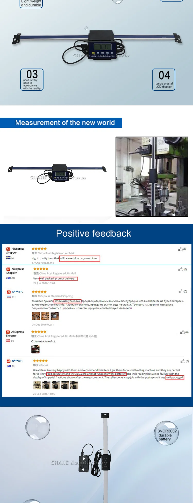 Линейка отлично и очень надежно упакована.Изготовлена точно,работает четко.Продавец отправил в тот же день. Товар курьером FedEx прибыл через 12 дней. Доставка дорогая-но это плата за скорость и надежность-курьер товаром футбол не играет.