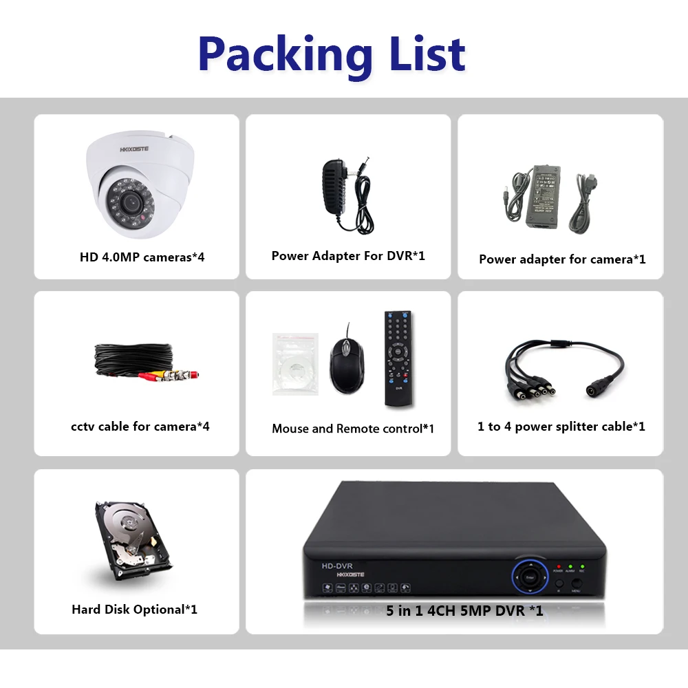 4 шт., камеры видеонаблюдения HD 4 МП; 4-канальный цифровой видеорегистратор 5,0 МП Мощный сетевой сервер; С облачной функцией P2P; Поддержка USB, мыши, резервного копирования; Поддержка Android,iphone,ipad, ПК, cms view; Поддерживает выход VGA и выход HDMI; Поддержка входа будильника, выхода будильника; Разрешение записи: 5,0 МП; С высоким коэффициентом сжатия видео H.265; Автоматический баланс белого, автоматическое управление коэффициентом усиления, задний светильник comp; Интерфейс HDD: SATA, поддержка между 500 ГБ и 8 ТБ; Мульти-язык меню вариант до 28 виды языка; * Поддерживает вход камеры 5,0 МП, выход HDMI и VGA; * Облачный сервис P2P для мобильных устройств Android/iOS, удаленный просмотр в любом месте в любое время; * Запись обнаружения движения. Видеорегистратор будет записан, когда обнаружите, что-то движется. Без Триггера, без записи, более интеллектуальный и компактный; * Оповещение по электронной почте и уведомление тревоги. Когда детектор движения сработает, видеорегистратор автоматически отправит звуковой сигнал и уведомление тревоги на вашу электронную почту, включая моментальный снимок на месте; * Несколько путей доступа к ПК, телефону и планшету, могут быть просмотрены клиентом ПК, приложением для телефона и IE, Хром, Firefox, сафариБраузер; * Поддержка 3,5 дюймов порт SATA жёсткий диск, емкость около 500 г/1T/2T/3T/4 ТБ/5 ТБ/6 ТБ/7 ТБ/8 ТБ, И менее 500 г не поддерживается ed. HD H.265 5MP AHD DVR цифровой видеорегистратор, поддержка аналогового и 1.0mp, 2.0mp, 3.0mp, 4.0mp и 5mpCVBS /TVI/CVI/AHD/IPКамера