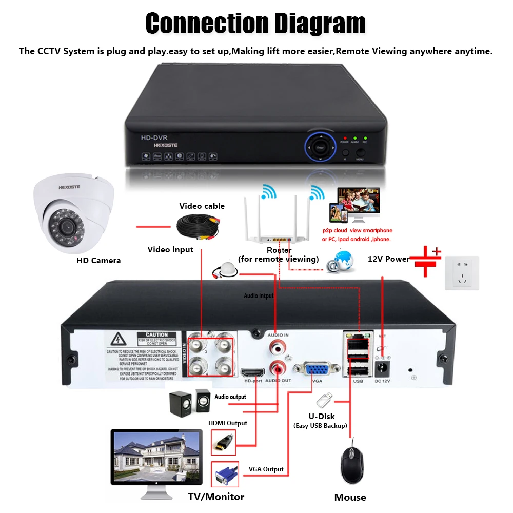 DVR FeaturesHDMI output / P2P iCloud / ONVIF/Email Alarm,Motion Detection
