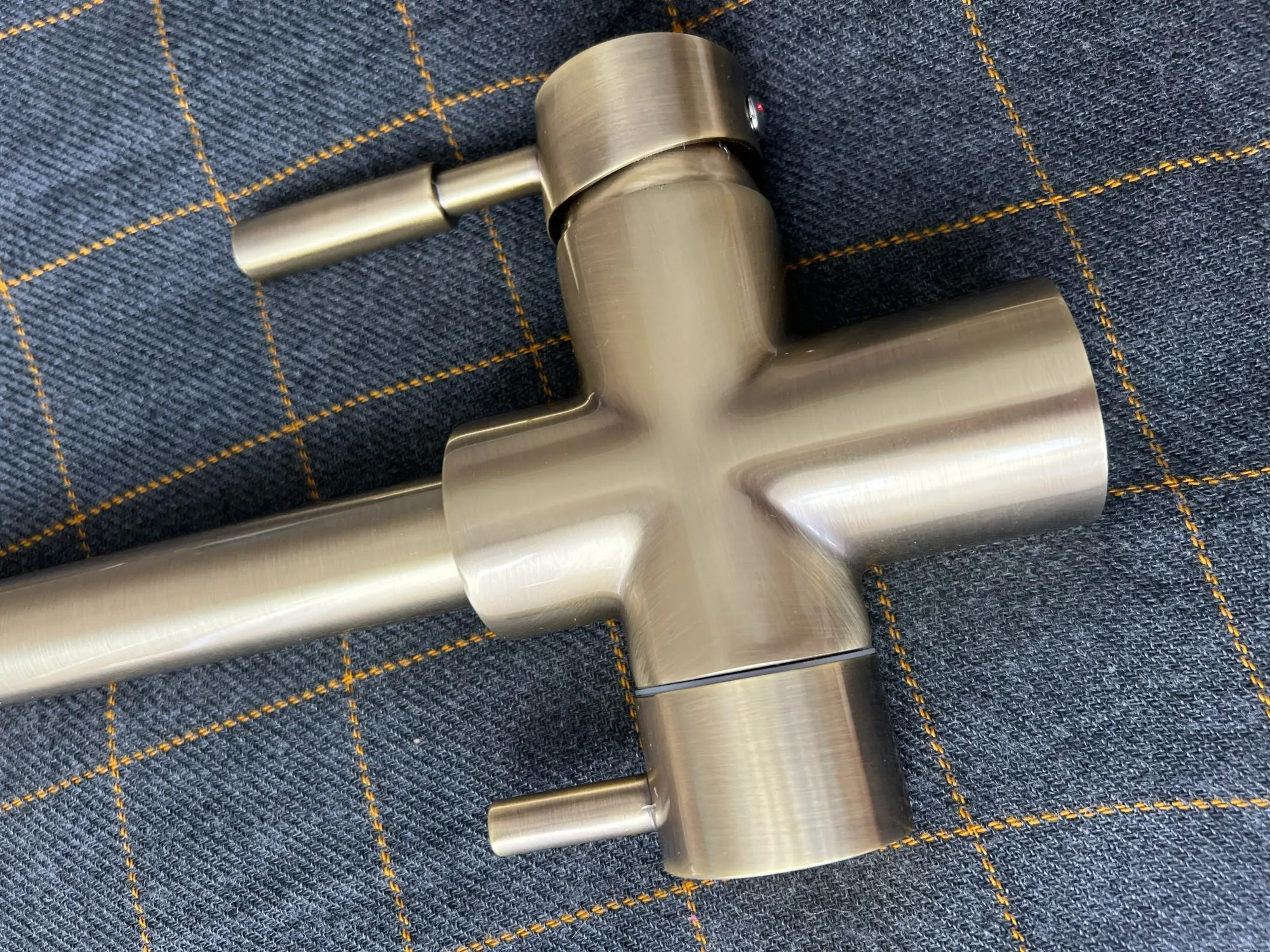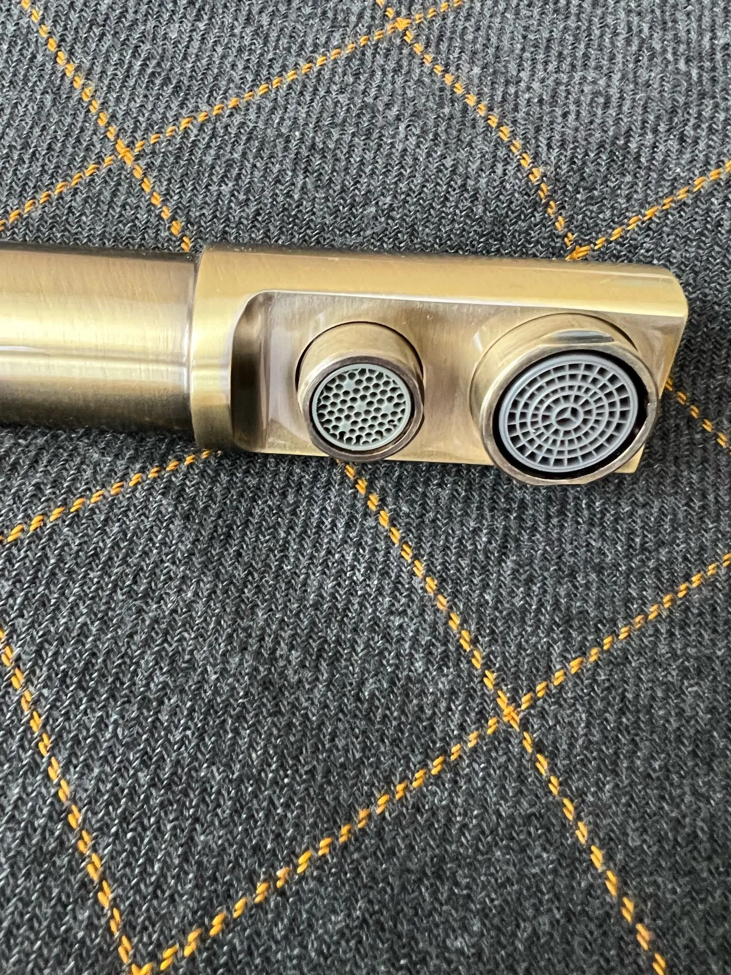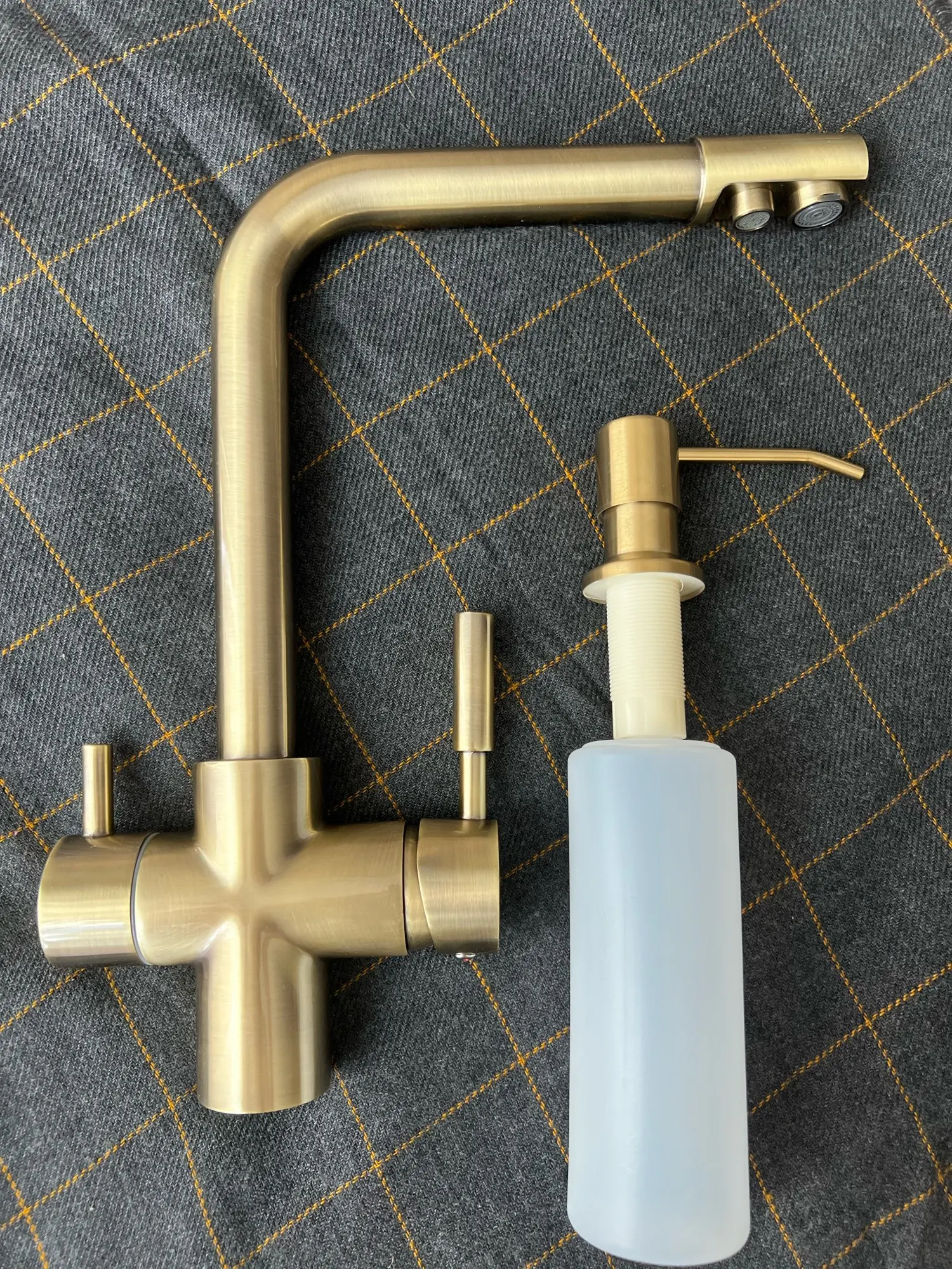 Красивый, тяжелый кран. Ручки плавно работают. Ещё не установили, поэтому как будет работать сам кран ещё не знаю. Надеюсь, что все будет хорошо. В подарок к золотому крану прислали серебряный дозатор. Золотой дозатор я покупала отдельно. Доставка быстрая