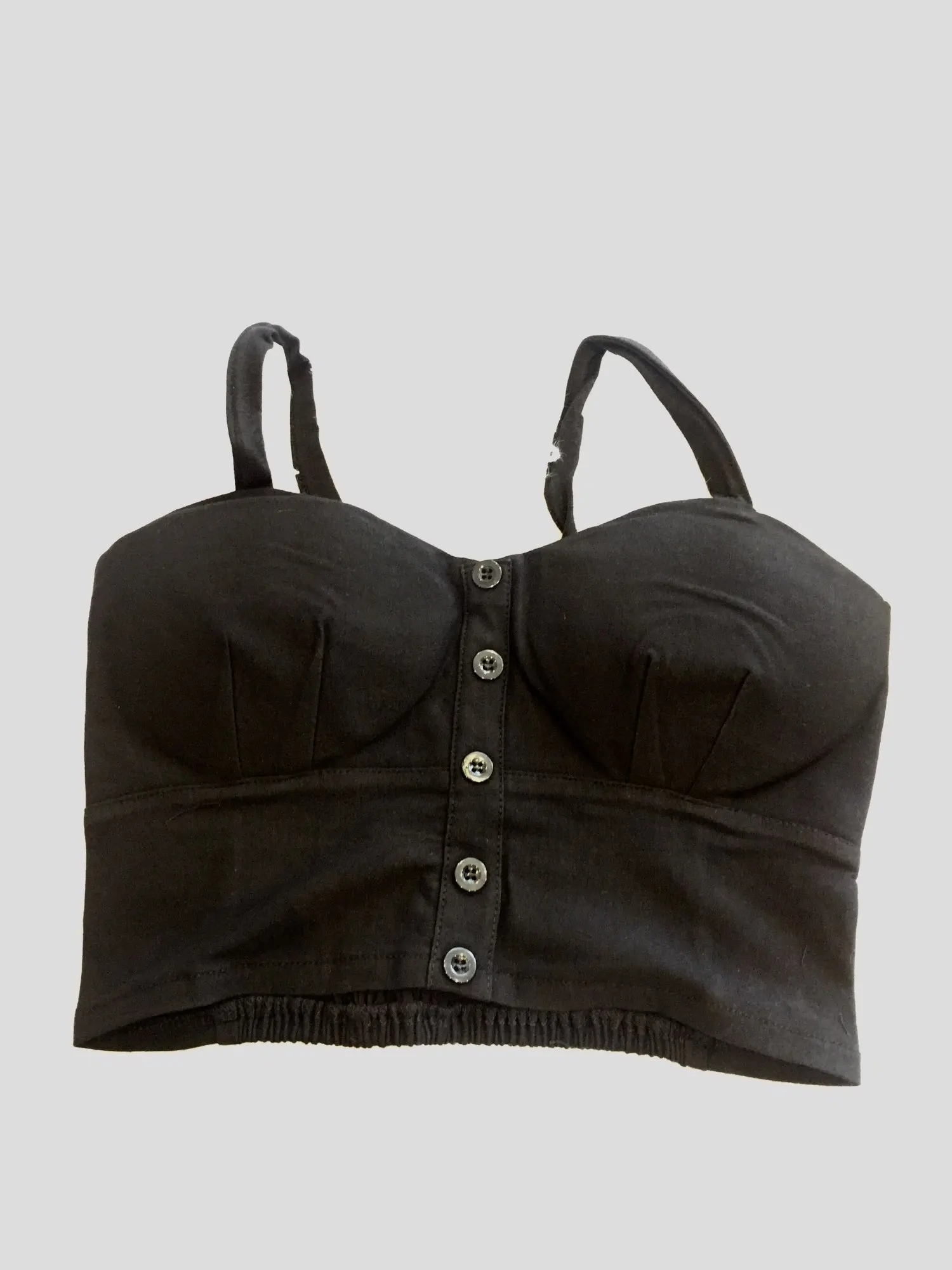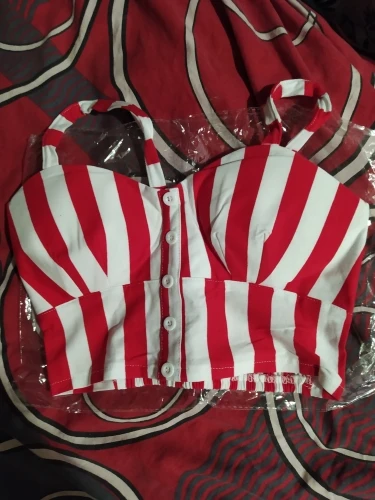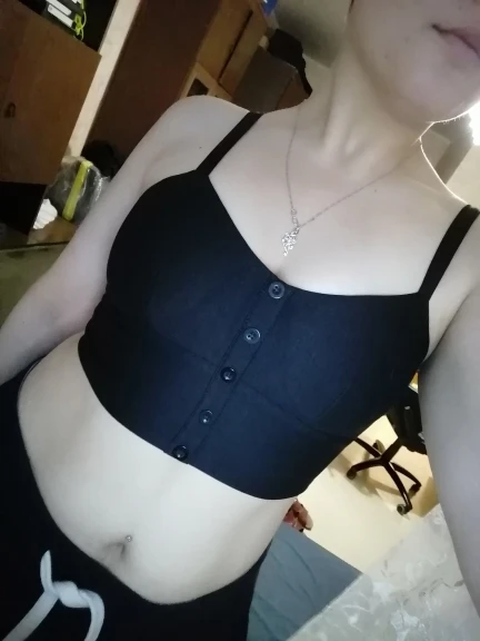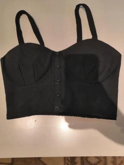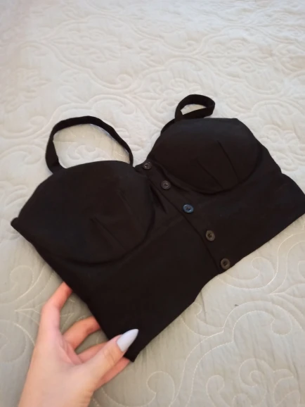 Топ пришел быстро, все соответствует описанию нитки не торчат, только пуговки спереди в действительности темнее. На мой обхват груди ≈100 из-за большой объема грудной клетки L-ка подошла отлично, ничего давит. Рекомендую.