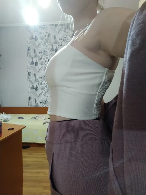 Заказывала сначала себе топ XS на ог 84 от 58 – сел идеально (см фото). Решила заказать этот топ размера L для мамы на ог 92 т 75 (примерно). Подошëл хорошо и в груди и талии, но по бокам от груди немного топорщится – думаю лучше носить с бюстгалтером на большой размер груди. Фото отдельно – размер L, фото на мне размер XS.