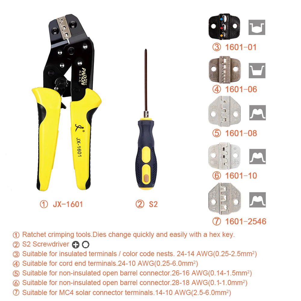 Характеристики:Название бренда: PARONМодель: JX-DS5Материал: Высокоуглеродистая сталь + сплавЦвет: желтый + черныйПодходящие клеммы и Диапазон обжима проводов:JX 1601-01: Цвет код гнезда + изолированные клеммы 24-14 AWG (0,25-2,5 мм ⊃ 2)JX 1601-06: конец шнура терминалы 24-10 AWG (0,25-6,0 мм ⊃ 2)JX 1601-08: неизолированные открытые баррель разъем 26-16 AWG (0,14-1,5 мм ⊃ 2)JX 1601-10: неизолированный открытый цилиндрический соединитель 28-18 AWG (0,1-1,0 мм соединитель 2;)JX 1601-2546: MC4 солнечной разъем клеммы 14-10 AWG (2,5-6,0 мм ⊃ 2)Размер проволоки: прибл. 190*80*20 мм/7,48*3,15 * 0.79inВес щипцы для проволоки: прибл. 348,5 г/12,29 унцийРазмер посылка: прибл. 23,5*18,5*4,5 см/9,25*7,28 * 1.77inВес посылка: прибл. 705 г/24,87 унцийПосылка: