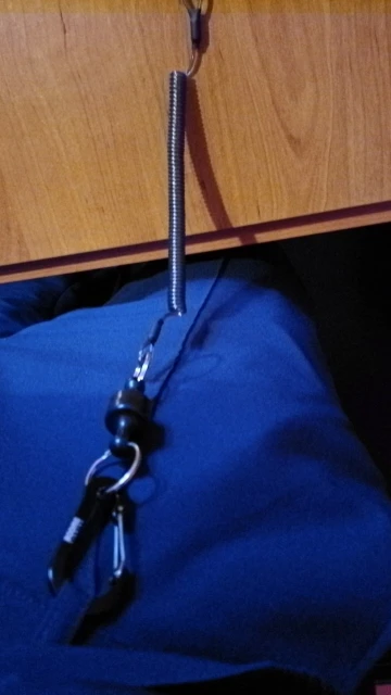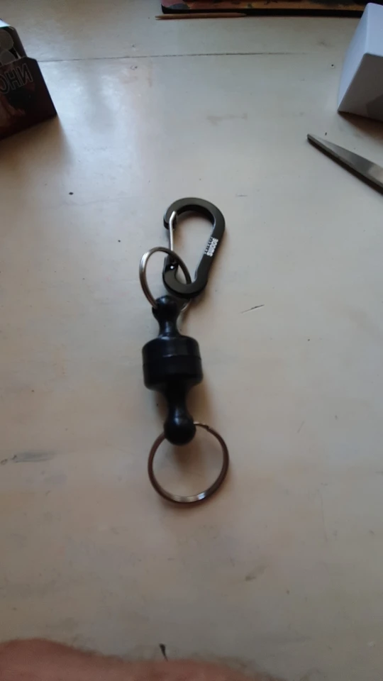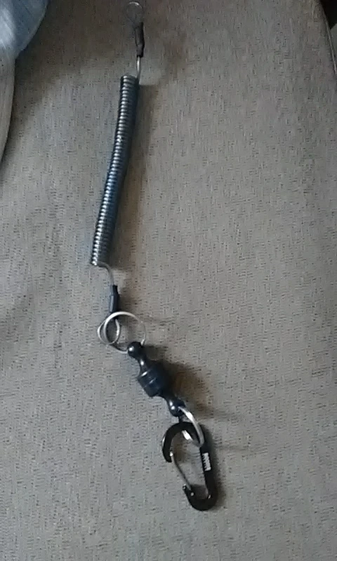 Шнурок потрясающий. Магниты достаточно прочные, чтобы держать инструмент до 1 кг, достаточно легко отменить и легко поймать снова. Катушка лучше прикрепить к воротнику держателя магнита, чем к кольцу для ключей (см. Фото). Таким образом, возможность ношения петель ниже.