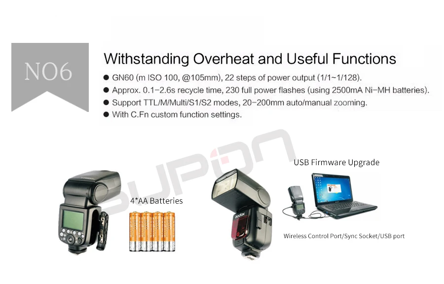 Прибл. 0,1-2,6 s время рециркуляции, 230 вспышек полной мощности (с использованием 2500 мА Ni-MH батарей)