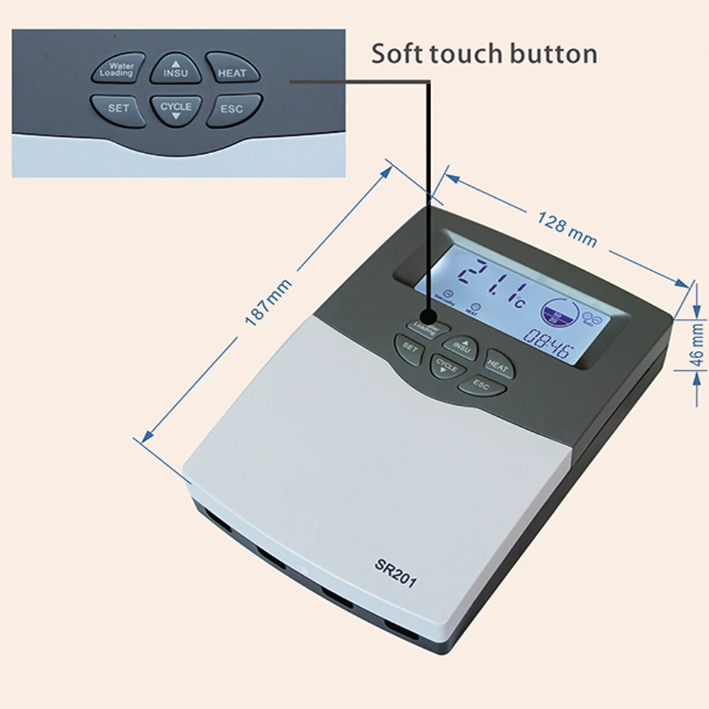 SR201-это контроллер с микрокомпьютером, полностью автоматический, используемый для интегрированного солнечного водонагревателя без давления. Он разработан с высокопроизводительным 32-битным однокристальным микрокомпьютером для интеллектуального управления. Все устройства имеют промышленный стандарт и могут свободно работать в холодной, высокой температуре и влажной среде.