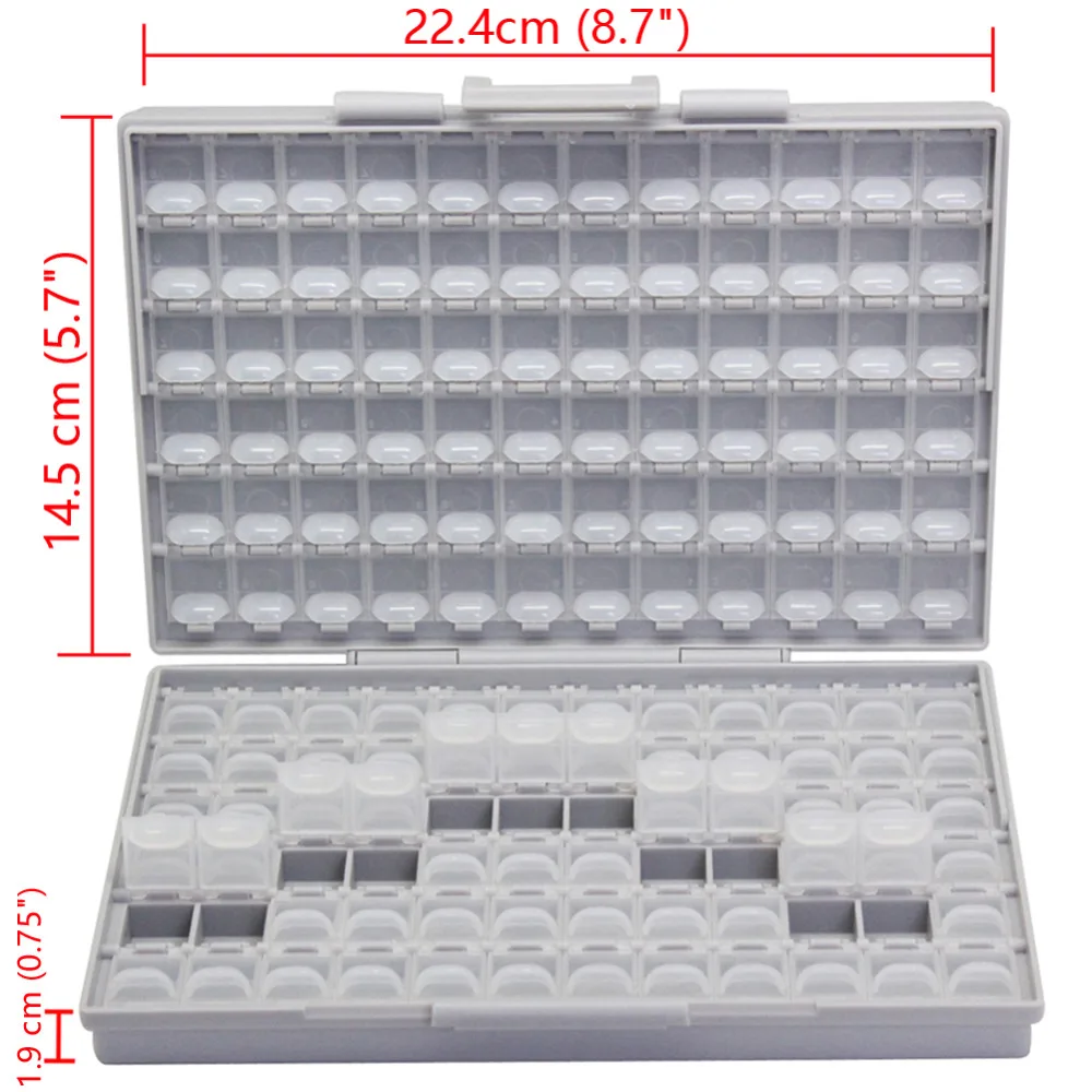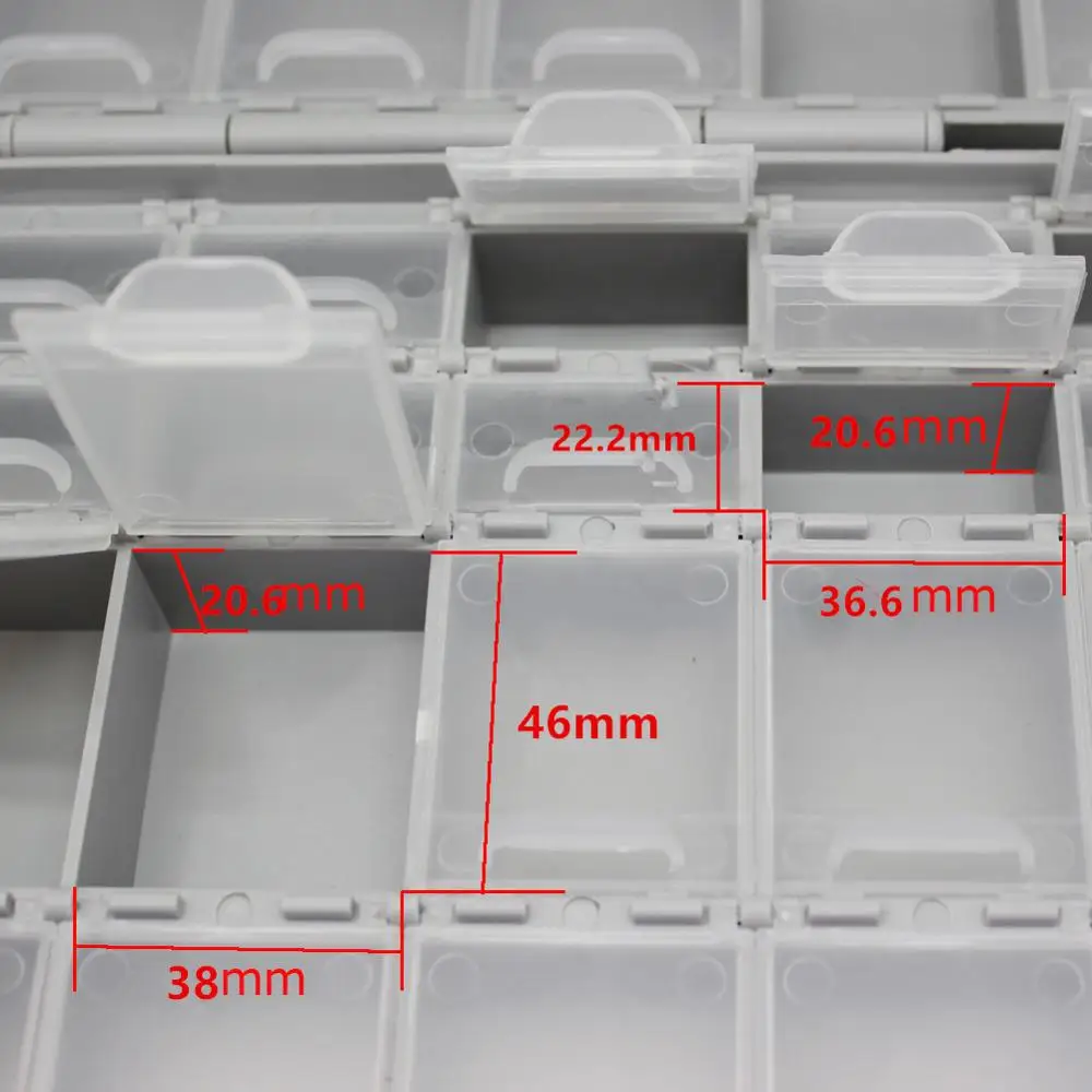 * Размеры каждого отсека 0,72 "(в) x 0,657" (Ш) x 0,4 "(г) или 18,3 мм (В) x 16,7 мм (Ш) x 10,2 мм (Г), вмещает до 300 шт. резисторов/конденсаторов 1206 размера