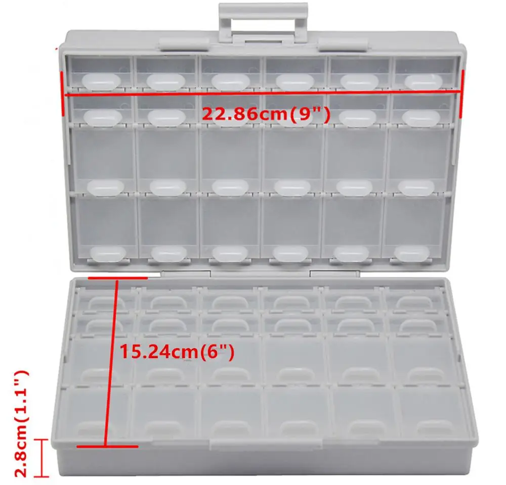 24 больших отсеков размером 1,65 "(Д) х 1,37" (Ш) х 0,78 "(Д) или 42 мм (Д) х 35 мм (Ш) x 20 мм (d), вмещает до 1000 шт. резисторов/конденсаторов 1206 размера