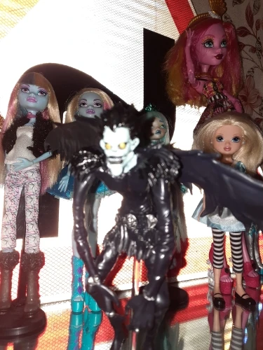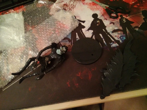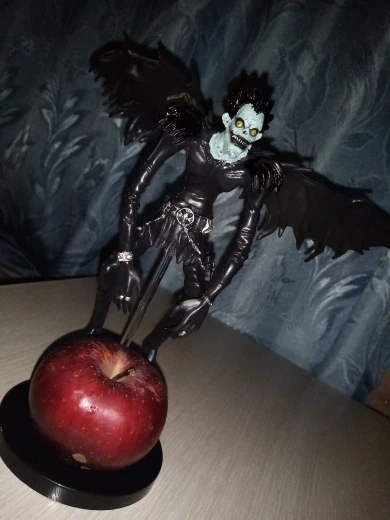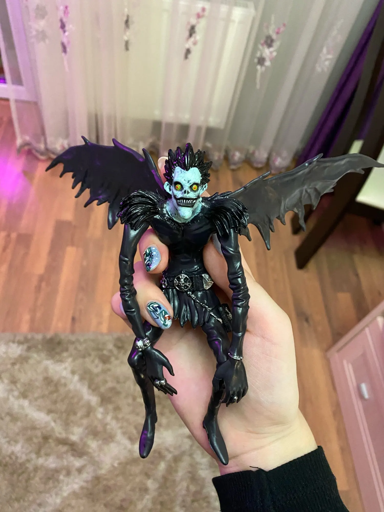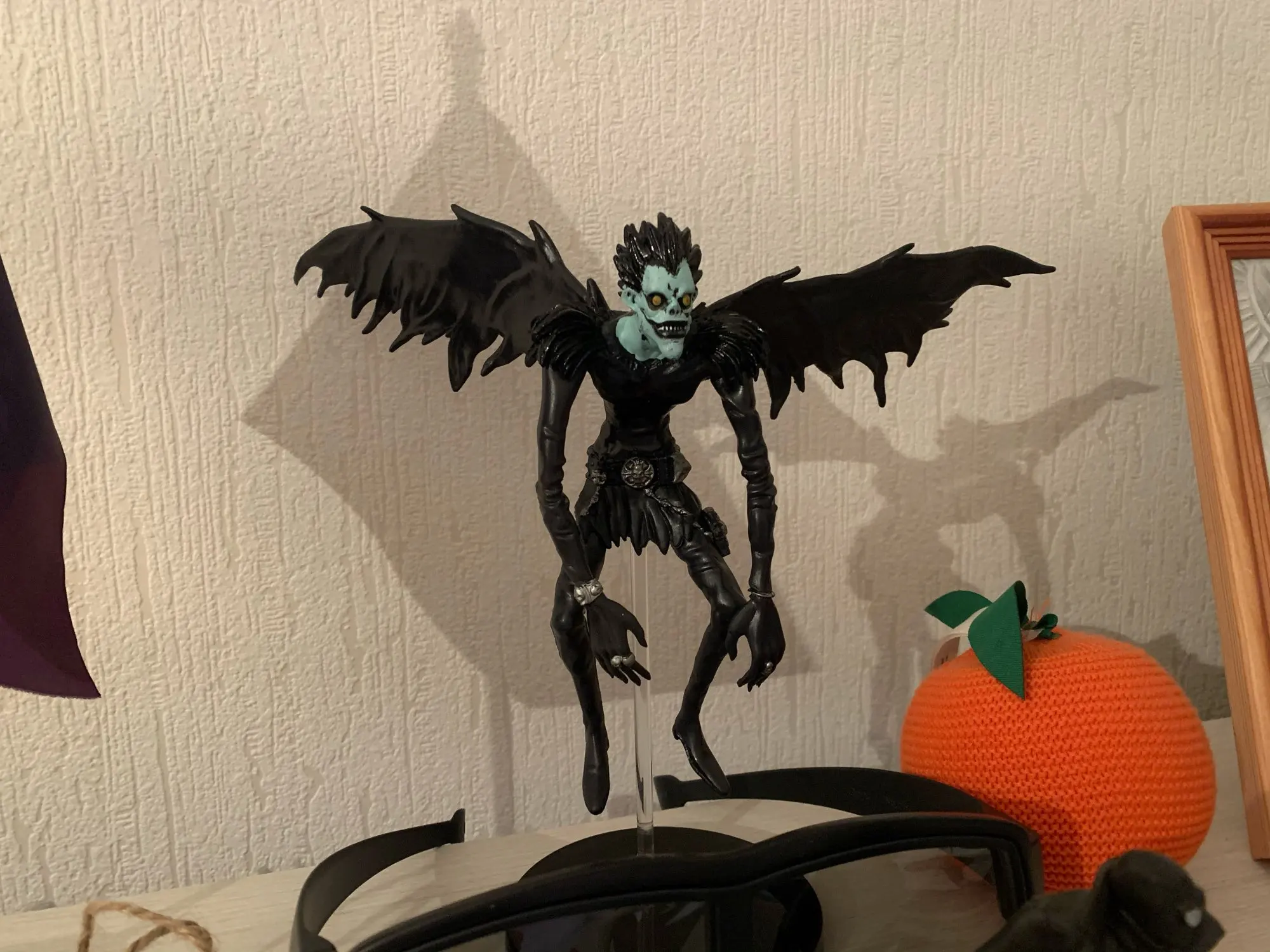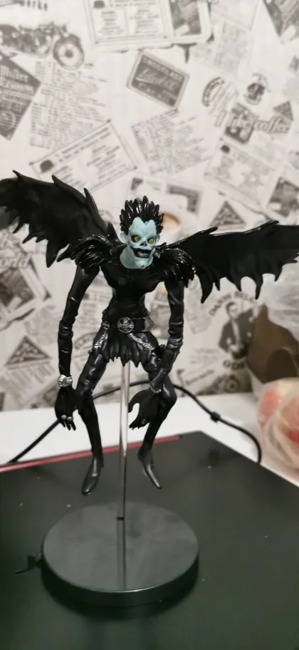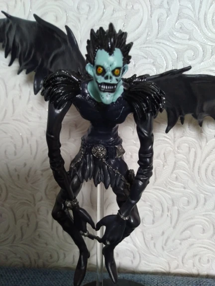 Красавчик прибыл за СУПЕР короткий срок. Хорошо упакован. Начитавшись отзывов, первое что сделала - посадила крылья на клей, как и палку подставки приклеила, но чтобы Рюка можно было перетаскивать. Кстати сидит очень прикольно) Советую не приклеивать его ж) Фигурка явно не супер высокая, фото с линейкой прилагаю. Зато размах крыльев не наврали. Мне качество вполне нравится. Минусы: слишком зеленый; краска с подошвы ботинок (глянцевая) неровно положена; кольца (синее и зеленое на разных руках) не цветные, а просто серебряные (но это я исправлю). Думаю добавить бедному богу смeрти пару яблок из глины)) А то ему как-то одиноко.