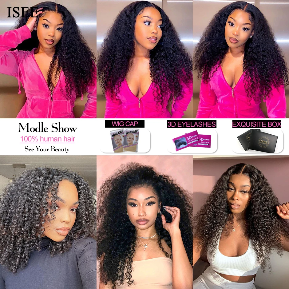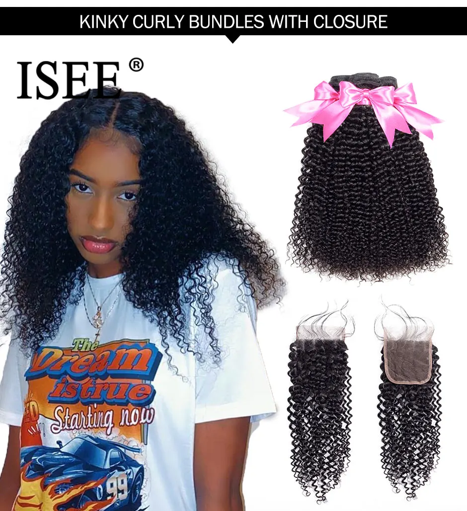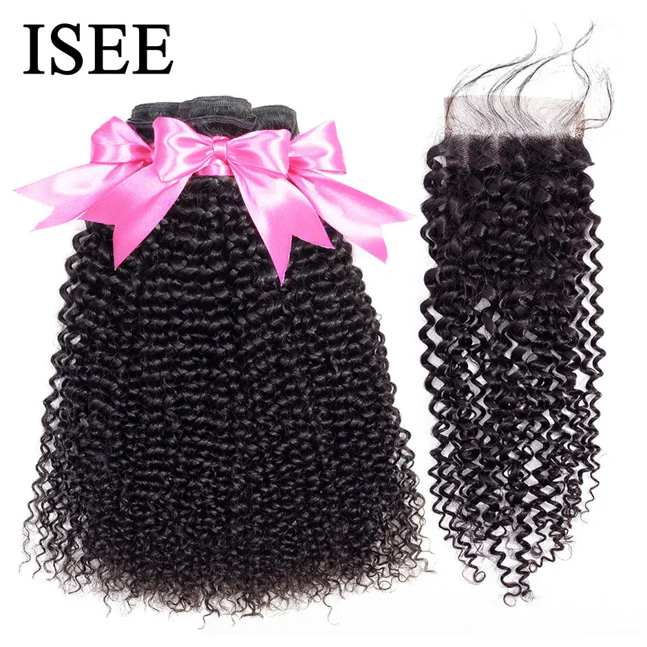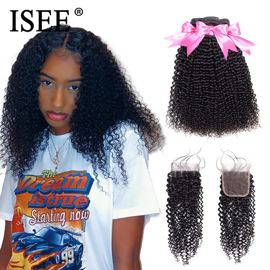 Монгольские кудрявые человеческие волосы пряди с закрытием ISEE волосы для наращивания 3 пряди с закрытием Remy кудрявые пряди с фронтальной