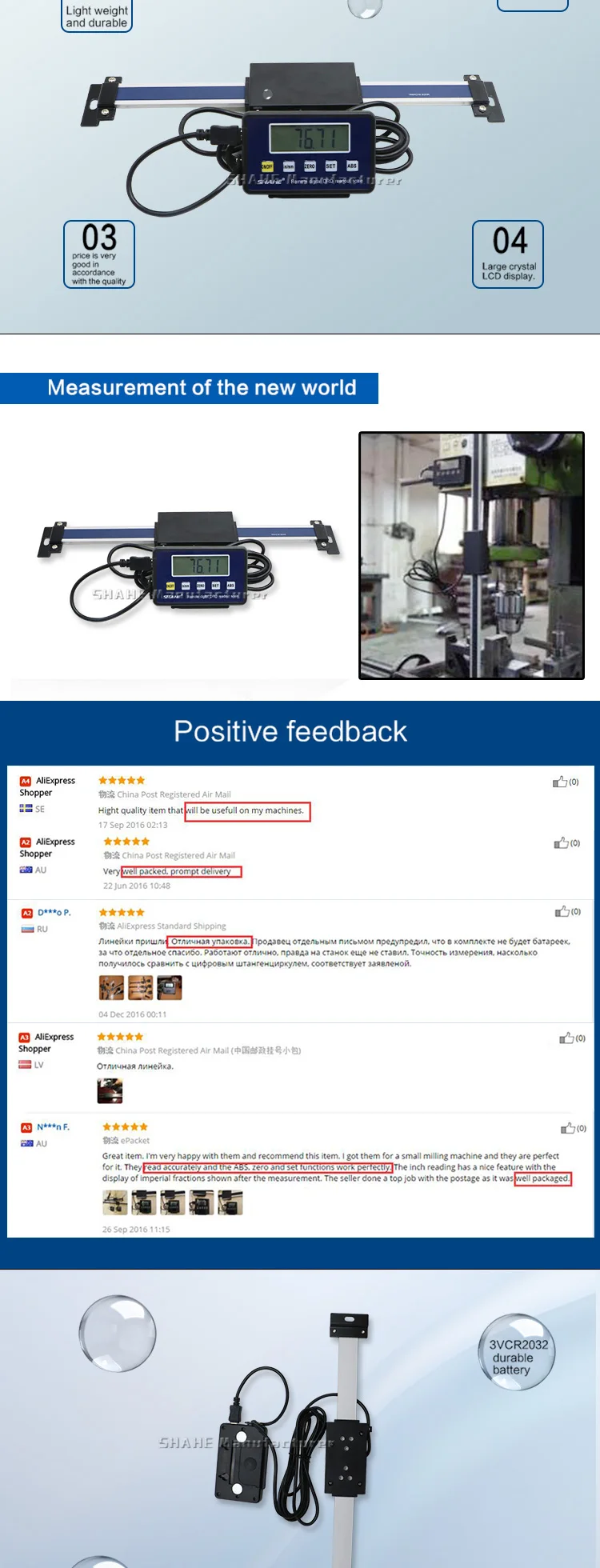 Заказал 12 октября и уже 15-го уже получил заказ, курьерской доставкой до квартиры (доставка из России). Продавцу огромная благодарность !!! Магазин добавляю в любимые ! Заказ доставлен в хорошей упаковке. Комплектация соответствует заказу, порадовало наличие 2-х батареек в комплекте. Точность показаний я оценил в сравнении с показаниями оптического штангеля CHAHE 300 мм. На расстоянии 300 мм максимальная разница показаний штангеля и линейки постепенно нарастает к середине измеряемого расстояния (оказалась не более 0.04 мм) и убывает к концу измеряемого расстояния. В начале и в конце шкалы показания совпадают идеально. Проверка проводилась неоднократно, результаты стабильные. Возможно проявились какое-то особенности способа сравнения. Планирую использовать с поворотным поперечным упором циркулярки. Изделие мне понравилось, продовца рекомендую.