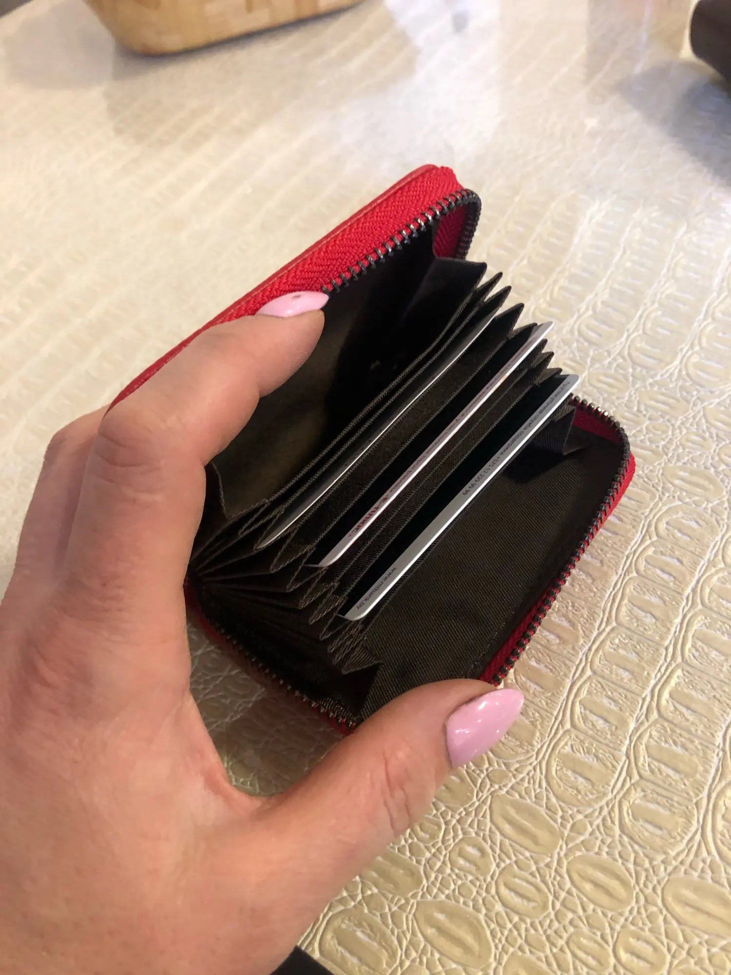 Все карточки поместились, а главное их удобно вытаскивать и искать нужную. Большие отсеки использую для паспорта и денег.