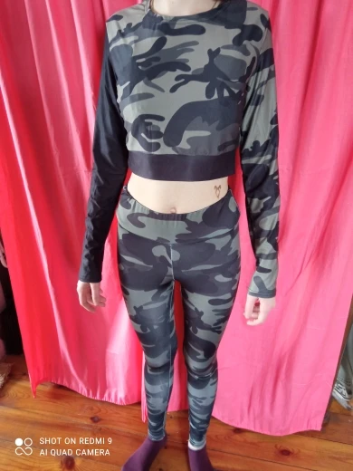 Качество отвратительное. Узор гораздо крупнее, симметричный. выглядит просто ужас . Швы расходятся, резинка не широкая, скручивается. я уже про топ не говорю. один рукав почему-то черный, все остальное - комуфляжное, сидит ужасно, абсолютно не поддерживает грудь.