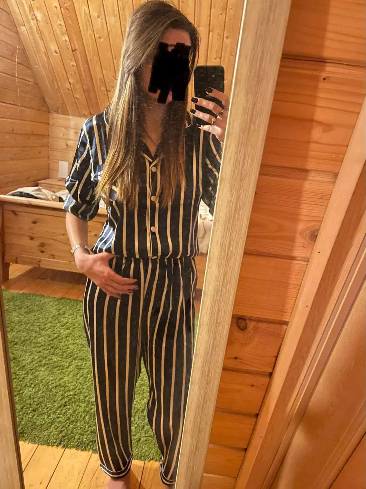 Пижамы очень хорошие, красивые и приятные к телу. Правда на синей пижаме в оригинале были белые пластмассовые пуговицы, которые сильно дешевили еë внешний вид, но если их перешить и заменить на более подходящие по цвету, восприятие кардинально меняется. В подарок продавец положил резинку с бантиком. Доставка в течение месяца. Товар и продавца рекомендую!
