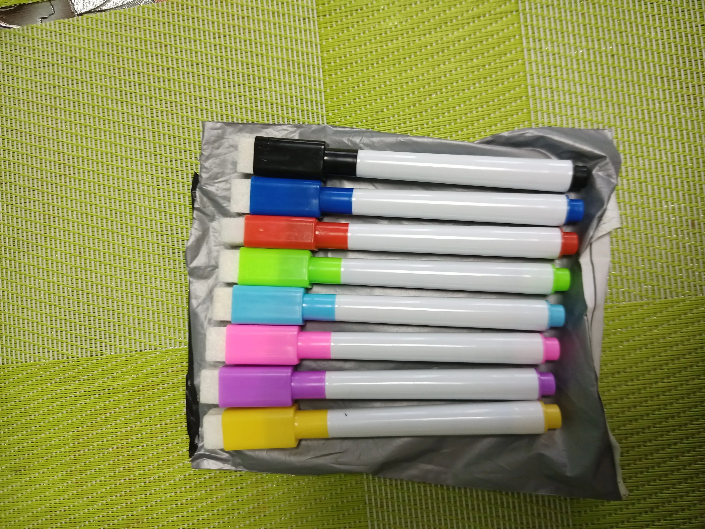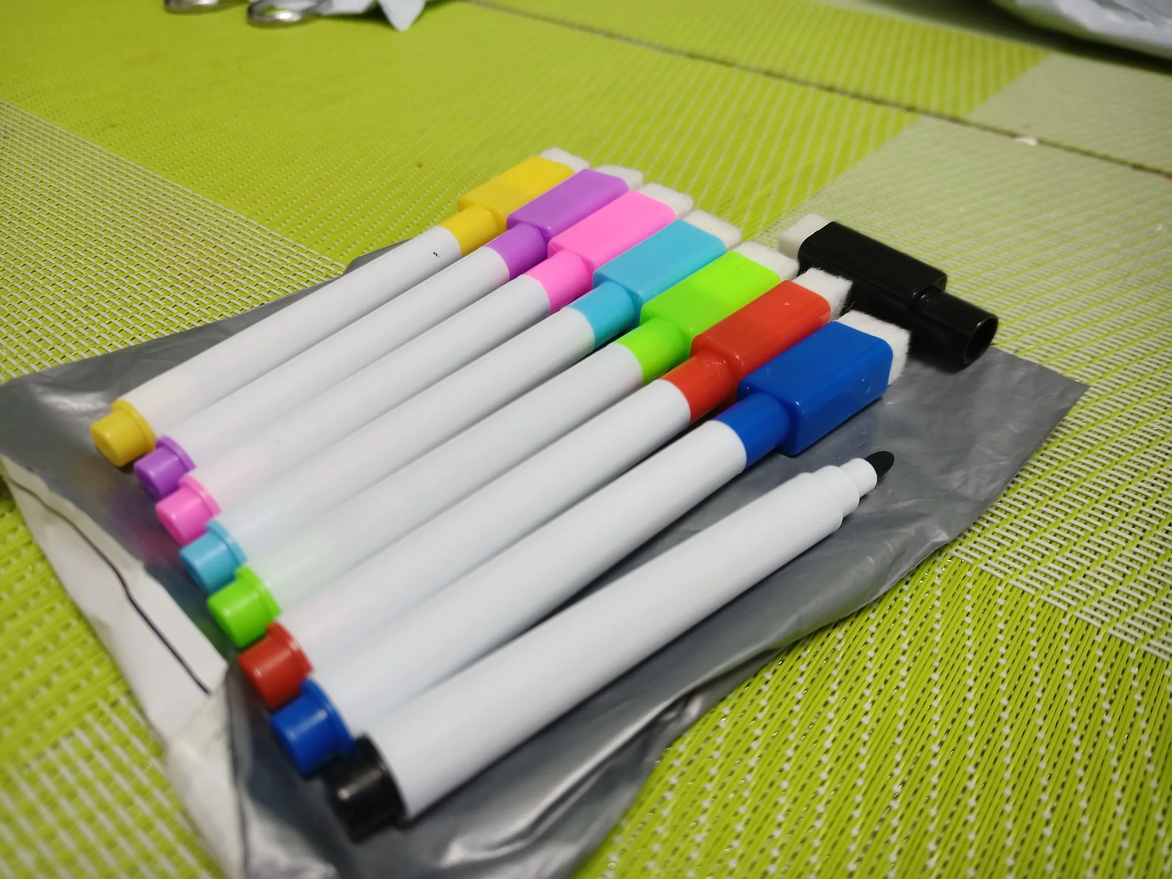 Посылка шла очень долго, застряла у нас в стране. Ждала 3,5 месяца. Как раз только хотела спор открывать и посылка пришла. Положили в почтовый ящик. Обычные фломастеры, на доске стираются.