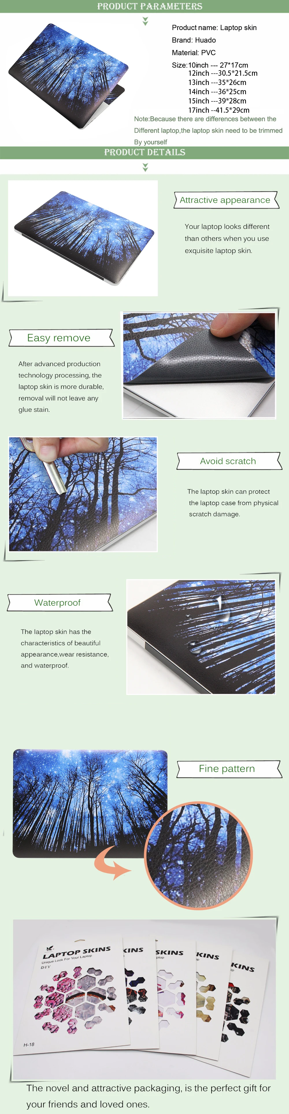 Товар доставлен в соответствии с описанием на веб-сайте. Он легко наносится на ноутбук, я использовал Скальпель для вырезания верхней крышки наклейки после того, как я наклеил его и выдавил любые пузырьки воздуха... С чистящими поверхностями al была сделана за 5 минут, моя дочь любит свой ноутбук еще больше!