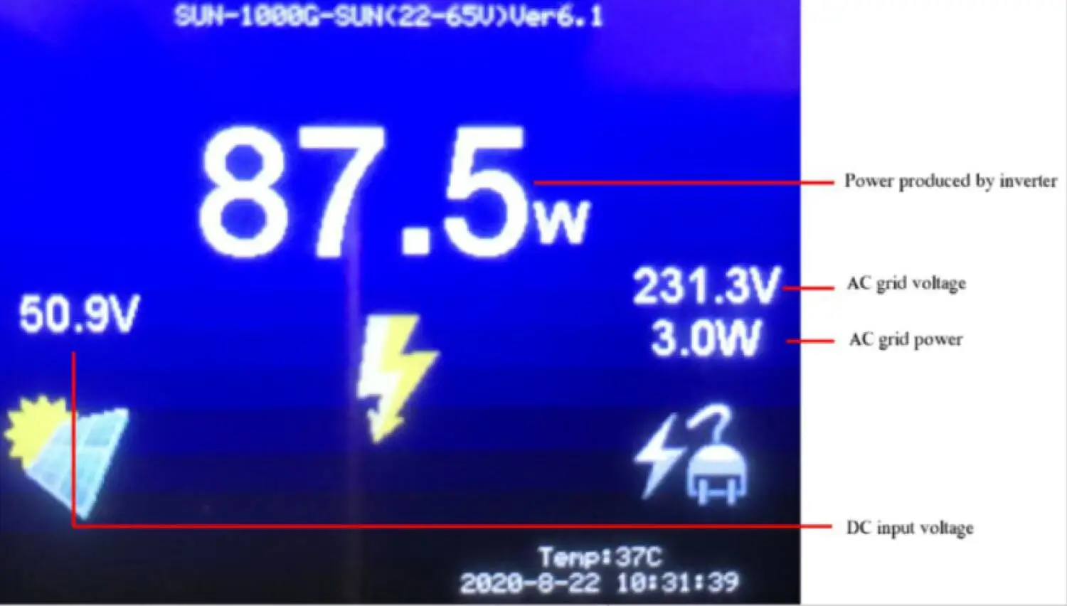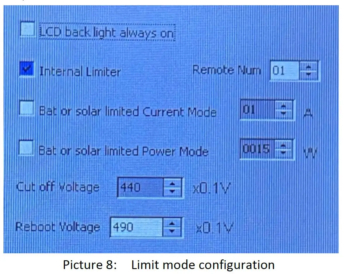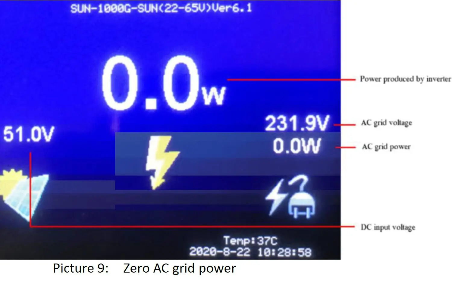 Если дисплей показан как на изображении 9, это означает, что датчик предела не подключен хорошо, или нет нагрузокПитание включено, вы можете проверить датчик предела и включить некоторые нагрузки. Если нет мощности нагрузки,Инвертор не производит мощность под лимитированной моделью.