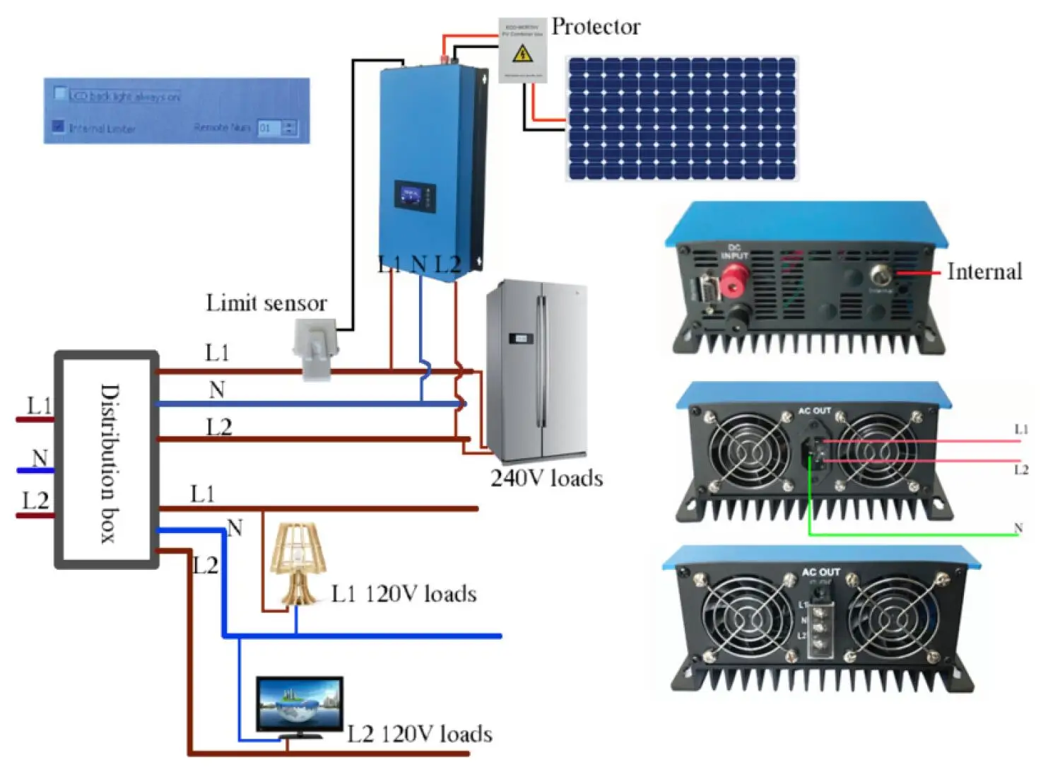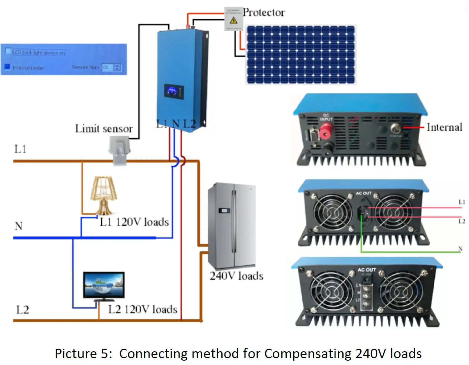 ВИнвертор должен быть подключен, чтобы компенсировать нагрузки 240 В. Потому чтоИнвертор будет генерировать тот же Номинальный подающий ток при L1 и L2, и240 В нагрузки также потребляют такое же значение тока при L1 и L2, так что сОграниченная функция инвертора, инвертор будет производить только мощностьЭто то же самое, что и мощность нагрузки менее 240 в, больше не будетПодача в сетку переменного тока. Поэтому, если нагрузка 240 В былаСоединены при отдельной линии и не смешивать с 120V грузы, вы можетеПодключите инвертор и закрепите датчик предела в качестве изображения 4.