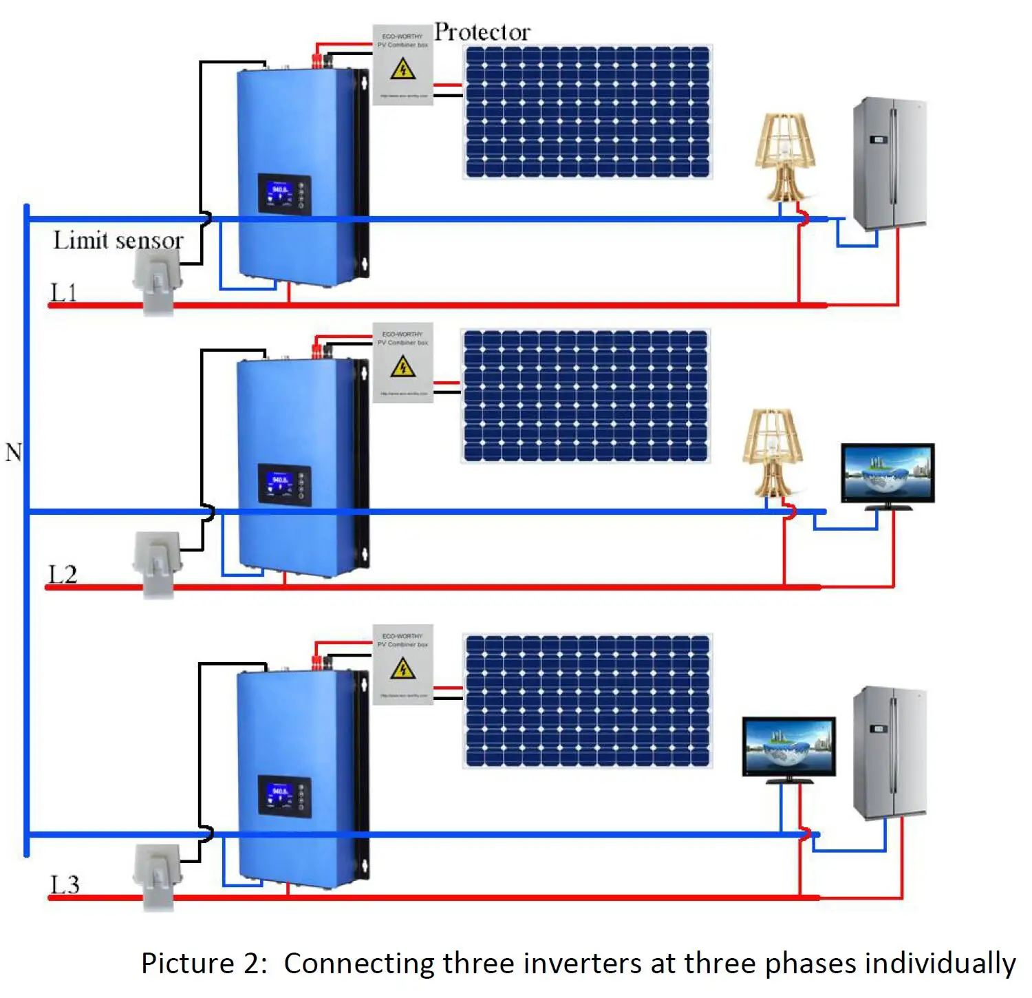 ЕслиВы хотите использовать больше инверторов на одной линии, чтобы генерировать больше энергииА также нужна ограничительная функция, вы можете подключить инверторы, такие как изображение3 (для двух инверторов). Два инвертора не будут производить одинаковую мощность,Но функция ограничения по-прежнему доступна. G линия будет подключена какНормально, поэтому не показано на картинке 3.