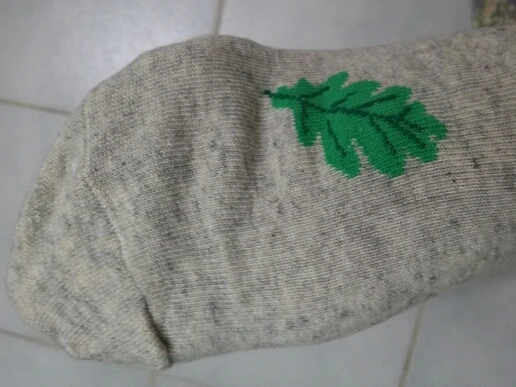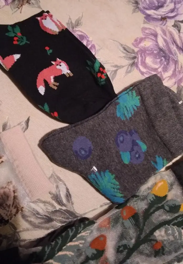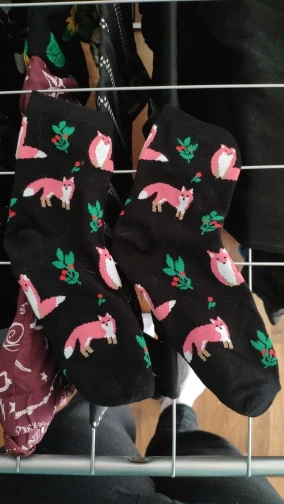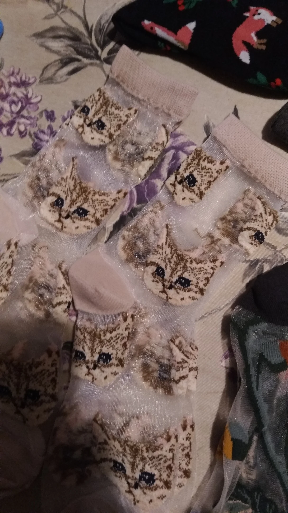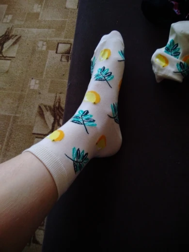 На фото носки выглядят лучше. В реале лисы не рыжие, а красноватые, зелёные ветки на фото более приглушенные, а на носках просто глаз режут. Но это мой косяк - надо было внимательнее смотреть отзывы с фото. Доставка долгая. С продавцом не общалась.